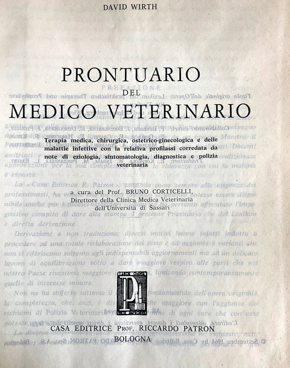 - collezionismo, manuali antichi, medicina veterinaria, David Wirth, prontuario veterinario, lessico, enciclopedia medica veterinaria, animali, cure, terapie, diagnostica, eziologia, malattie, equini, bovini, ovini, cani, gatti, cavalli, bestiame, profilassi, farmacologia, farmaci, polizia veterinaria, infezioni, chirurgia, vaccinazioni, vaccini, posologia, dosi, guide pratiche, didattica, università, insegnamento, lezioni, corsi, voci, lemmi, libri rari illustrati, fuori catalogo, malattie infettive, zoonosi, parassiti, batteri, virus, alimentazione, gravidanza, parto, clinica veterinaria, pratica professionale, Veterinaria, Medicina, Manuali
