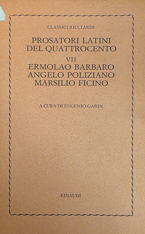 PROSATORI LATINI DEL QUATTROCENTO. vol. VII. ERMOLAO BARBARO, ANGELO POLIZIANO, MARSILIO FICINO