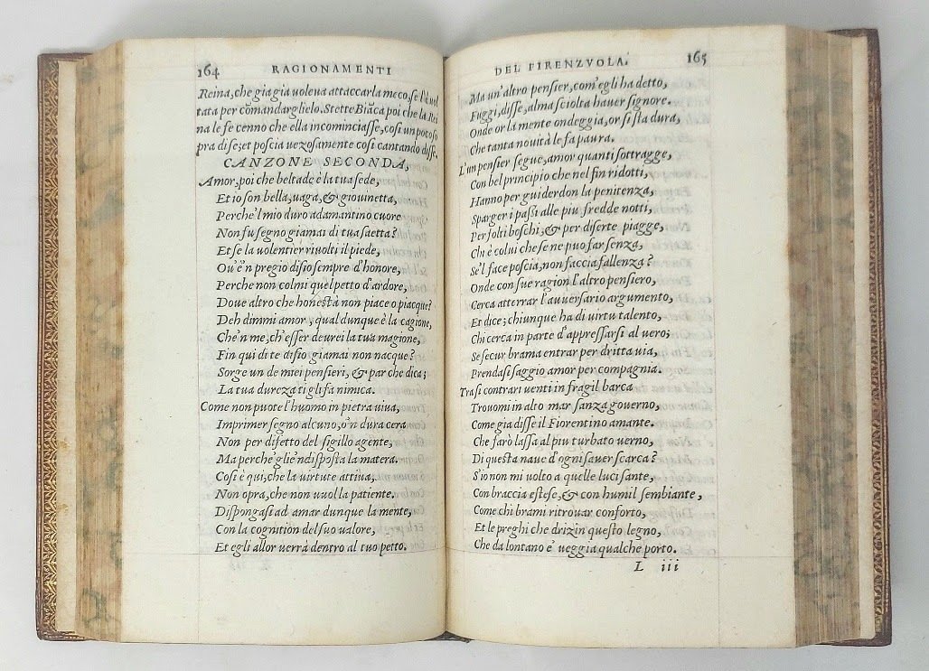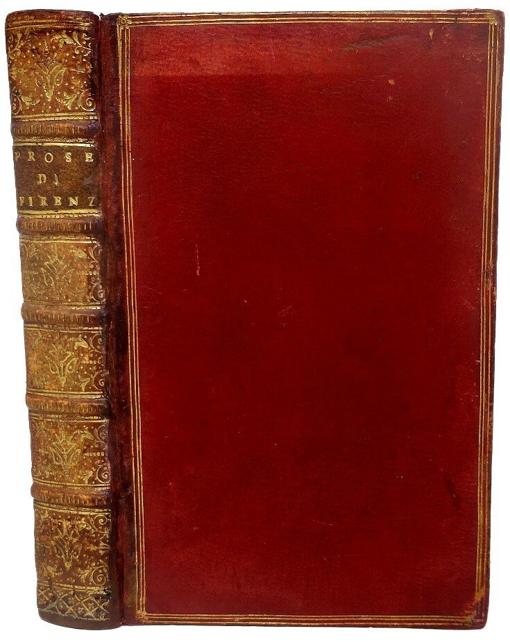 >in-8 (158x102 mm), pp. 430 (ma con errore di numerazione da pag. 271 a 291, testo completo, mancano in fine tre fogli: uno con il Privilegio e due bianchi). Carattere corsivo, impresa dei Medici sul titolo, numerose grandi iniziali ornate in silografia. Legatura settecentesca in pieno marocchino granata, filetti oro sui piatti, dorso a nervi ornato, tagli dorati, dentelle interne, sguardie in bella carta dorata (cerniere deboli, macchie alla pelle dei piatti). Seconda edizione (dopo la prima del 1548, Giunti) di importante testo letterario, elegante ed ameno, diviso in sette capitoli: "Discorsi de gli animali. Ragionamenti amorosi. Epistola in lode delle donne. Novelle otto. Discacciamento delle Lettere. Dialogo della bellezza delle Donne". Agnolo Giovannini, detto Firenzuola (di Firenze, 1493-1545), assai amato dai contemporanei, fu pure Abate di Vallombrosa. Tutto sommato bell'esemplare, fresco (ma margini bianchi del foglio di titolo pesantemente rifatti, e mancanti gli ultimi 3 fogli). Moreni, Annali del Torrentino, p.208, XIII. Gamba, n.455 ''rara''. Adams, I, 501