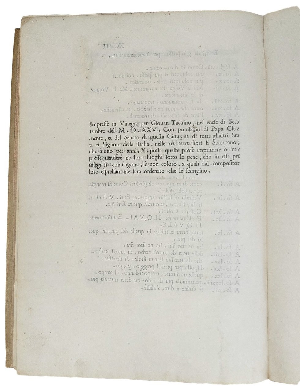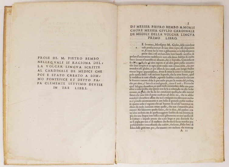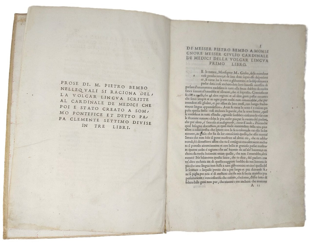 >in-folio piccolo (mm 310x214), 96 ff. (numerati I-XCIIII, recto della prima carta bianco, titolo al verso, conservato l'ultimo bianco), buona legatura secentesca in pergamena, titolo in oro su tassello granata al dorso, tagli spruzzati. In elegante carattere romano di grandi dimensioni, frequente uso di capitali; in questo caso molto nitidamente impresso. Editio princeps, non comune, dedicata a Papa Clemente VII Medici (eletto nel 1523) di opera seminale della letteratura italiana. Le Prose ebbero fondamentale importanza nelle discussioni linguistiche del cinquecento, proponendo il fiorentino quale lingua letteraria per l'intera penisola d'Italia, cioè conferendo dignità al volgare rendendolo pari per regolarità al latino. Pietro Bembo ( Venezia 1470-Roma 1547) fu letterato e storico assai illustre ed ebbe vita complessa e intensa sotto l'aspetto culturale e umano. Prima edizione, che presenta tutte le caratteristiche distintive per distinguerla dalla contraffazione veneziana coeva: a carta G6r, correzione ms. dell'erroneo "altre" (per "arte"), disposta dall'autore; specchio di stampa 200x126 mm (contraffazione 200x121 mm); finale del colophon: "le stampino" (contraffazione: "la stampino"). Esemplare assai grande di margini, non pressato e genuino; rari aloni a qualche angolo e poche macchiette, qualche forellino di tarlo ai primi 4 e agli ultimi 4 ff. Non descritto in varie bibliografie. Gamba, Testi di Lingua, n.136 (note). British Museum Library, Italian, p.81.