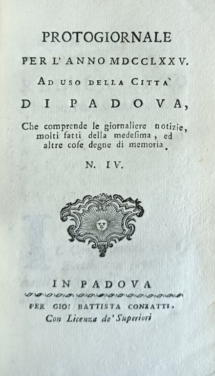 PROTOGIORNALE PER L' ANNO MDCCLXXV AD USO DELLA CITTÀ DI PADOVA, CHE COMPRENDE LE GIORNALIERE NOTIZIE; MOLTI FATTI DELLA MEDESIMA, ED ALTRE COSE DEGNE DI MEMORIA. N. IV