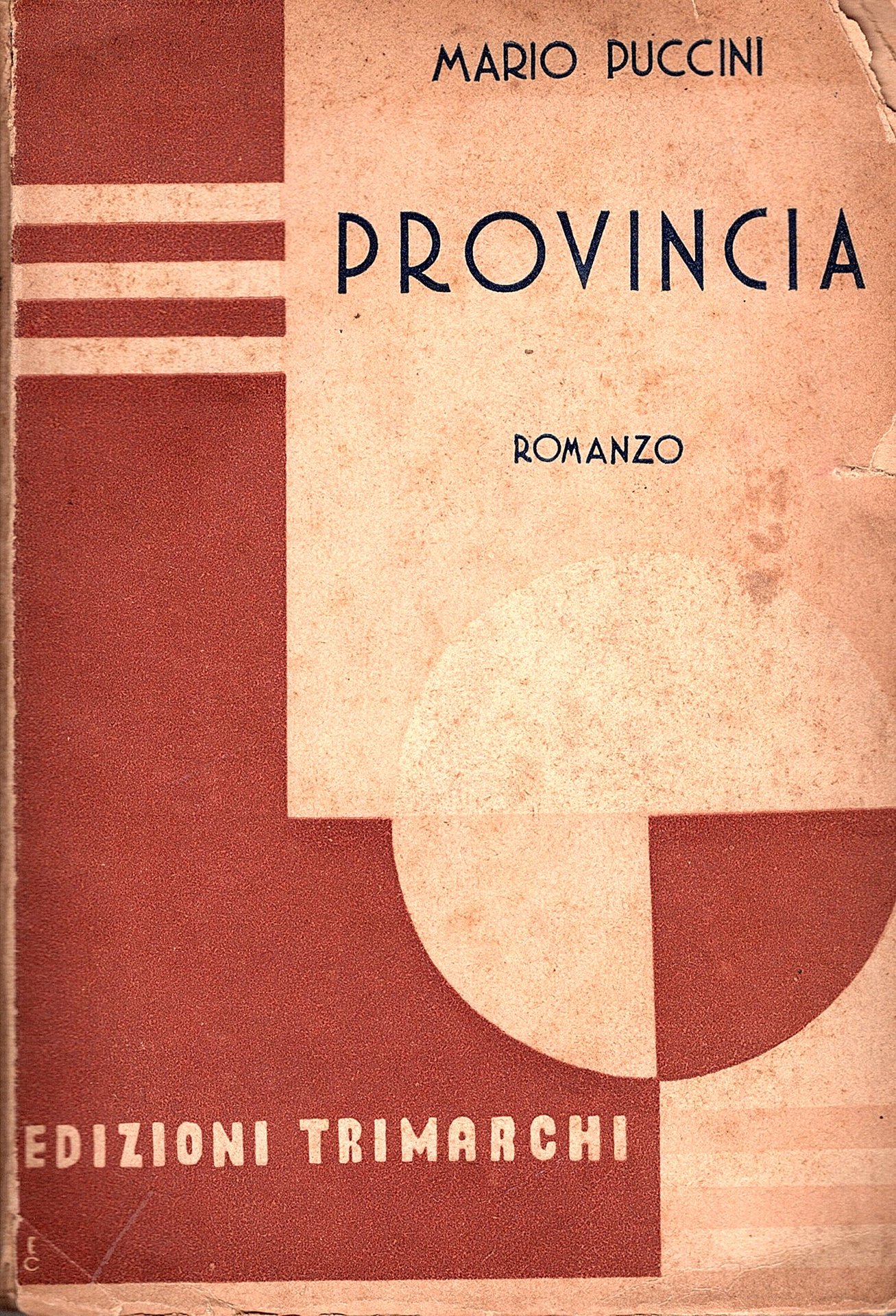 In-16° (19x13 cm), pp. 302, (2), brossura editoriale con titoli in bianco e nero al dorso e al piatto anteriore con grafica geometrica razionalista. Più che buon esemplare protetto da velina. Edizione originale di questo romanzo a sfondo critico del conformismo borghese scritto nel 1913 ma pubblicato solo vent'anni dopo dallo scrittore ed editore marchigiano (1887-1957).