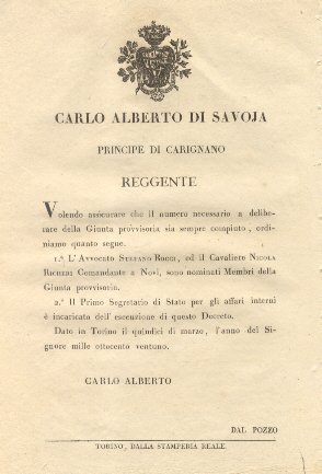 Provvedimenti di Carlo Alberto di Savoia, Reggente, col quale nomina l'Avvocato Stefano Rocic, ed il Cavaliere Nicola Richeri Comandante a Novi, Membri della Giunta provvisoria. 15 marzo 1821.