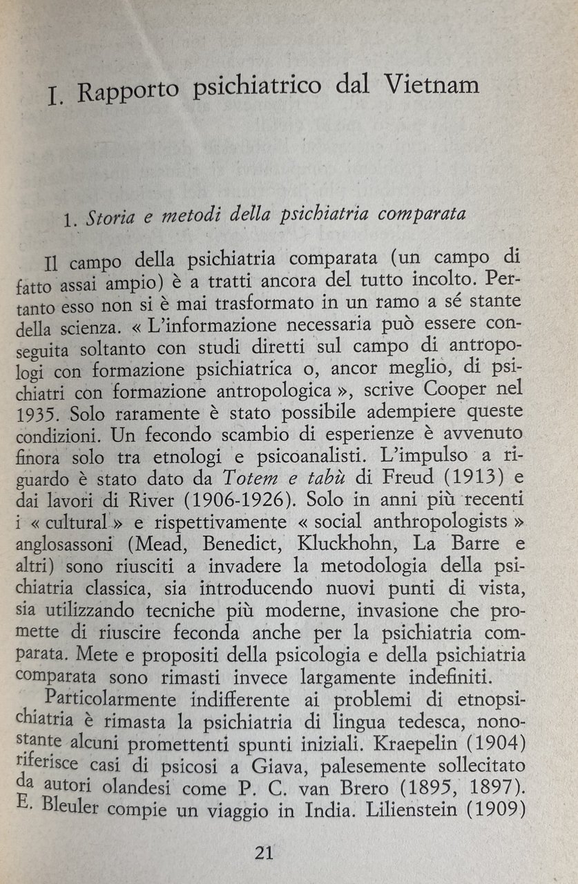 Soggetti: Etnopsichiatria Scienze psichiatriche Studi sociali Rapporto psichiatrico Vietnam Storia Metodi Psichiatria comparata Istituzioni Fabbisogno Asia Malato mentale Malattia mentale Disturbi psichici Ambiente familiare Assistenza Cura Medici Pazienti Congiunti Visita medica Dati statistici Comportamento Vietnamiti Reparti chiusi Sintomi Malattie psichiche Bibliografia Problemi fondamentali Schizofrenia Io Personalità borderline Schizofrenici Società Borghesia capitalistica transculturale Capitalismo Istanze Pratiche Socializzazione Critica concettuale Perfezionamento Ricerca Prassi Stati depressivi Depressione Consultazione Riferimento Terapia Cultura Clinica Denaro Metodi Sistemi di pagamento Relazioni Rapporto medico-paziente Comunità terapeutica Psicosi Tossicodipendenza Atteggiamento tossicomanico Stigma Identità Decadimento sociale Aggressività Ruoli Patologie Delinquenza Criminalità Inserimento sociale Isolamento Reclusione Sessualità Matrimonio Internamento Internati Conflitto Riabilitazione Barriere linguistiche Psicoanalisi Scienza Potere Psicopatia Sociopatia Violenza Adolescenti Stupro Donne Saggistica Collezionismo Libri rari Vintage fuori catalogo Reportage Inchieste Medicina Classici Psicologia Guerra Ospedali Psichiatrici Americani Lingua Barriere Linguistiche Psicanalisi Anni Sessanta Vietnamesische Lehrjahre Saigon Wahnsinnslogik Verstehbarkeit schizophrener Erfahrung Follia Pazzia Transkulturelle Psychiatrie Viaggio Eine Reise Kritische Lavoro Funzionari Fronte Liberazione Buddisti Buddismo Danang Villaggi Francesi Bombardamenti Soldi Hanoi Hänschen Juliette Kanish Khanh Comunisti Delta Mekong Persone Militari Nghi Nguyen Nord Ufficiali Pagoda Phnom Penh Polizia Quang Ngai Quang Tri Quat Qui Nhon Raoul Regime Soldati Guerriglieri Guerriglia Impatto psicologico Conseguenze Sciopero Studenti Sud Thieu Tri Quang Tuân Tuong Viet Kong Viet Minh Peste bubbonica Vittime Colera Shock Epidemie Servizi sanitari Epatectomia Igiene Immunizzazione Inoculazione Avvelenamento Poliomielite Popolazione Problemi Reagenti Bollettino Riso Governo Vaiolo Specialisti Chirurgia Tortura Tracoma Trattamento Tubercolosi Tifo Vaccini Ferite Suicidio Michel Foucault Dorner Klaus Mobius Koch Goffman Tolle Merton Talcott Parsons Glueck Rainwater Tedeschi Tirocinio Razzismo Hans Mausbach Classismo Classe media Povertà Circolo Mannheim Das Argument Mercato Consumismo Nevrosi Diagnosi Soggetti sani Movimento studentesco Ereditarietà Genetica Ideologie politiche Dasein Sociologia Angoscia Noia Filosofia Heidegger Fenomenologia Binswanger Isteria Jung Freud Transfert Gestalt Jones Basaglia Equipe Élite Neurologia Interesse Germania Giava Antropologia Kraepelin Totem Tabù India Bleuler Jaspers Husserl Kleist Lang Adorno Lombroso Etnologia Malinowski Marcuse Repressione Parin Abraham Bateson Etica professionale Lévy-Strauss Bambini Educazione Identificazione Genitori McCord Mendel Vries Correns Morel Simmons Ethnopsychiatry Psychiatric sciences Social studies Psychiatric report History Methods Comparative psychiatry Institutions Need Patient Mental illness Mental disorders Family environment Assistance Care Doctors Patients Relatives Medical examination Statistics Behavior Vietnamese Closed wards Symptoms Mental illnesses Bibliography Fundamental problems Schizophrenia Self Borderline personality Schizophrenics Society Transcultural capitalist bourgeoisie Capitalism Instances Practices Socialization Conceptual criticism Improvement Research Practice Depressive states Depression Consultation Reference Therapy Clinical culture Money Methods Payment systems Relationships Doctor-patient relationship Therapeutic community Psychosis Drug addiction Identity Social decay Aggression Roles Pathologies Delinquency Criminality Inclusion Isolation Imprisonment Sexuality Marriage Internment Internees Conflict Rehabilitation Language barriers Psychoanalysis Power Psychopathy Sociopathy Violence Adolescents Rape Women Non-fiction Collectibles Rare books Out of print Investigations Medicine Classics Psychology War Psychiatric hospitals Language Barriers Psychoanalysis Sixties Madness Madness Travel Work Officials Liberation Front Buddhists Buddhism French Villages Bombings Money Communists People Military North Officers Pagoda Police Soldiers Guerrillas Psychological impact Consequences Strike Students South Bubonic plague Victims Cholera Epidemics Health services Hepatectomy Hygiene Immunization Inoculation Poisoning Polio Population Problems Reagents Bulletin Rice Government Smallpox Specialists Surgery Torture Trachoma Treatment Tuberculosis Typhus Vaccines Wounds Suicide Germans Internship Racism Classism Middle class Poverty Circle Market Consumerism Neurosis Diagnosis Healthy subjects Student movement Heredity Genetics Political ideologies Sociology Anguish Boredom Philosophy Phenomenology Hysteria Neurology Interest Germany Java Anthropology Taboo Ethnology Repression Professional ethics Children Education Identification Parents