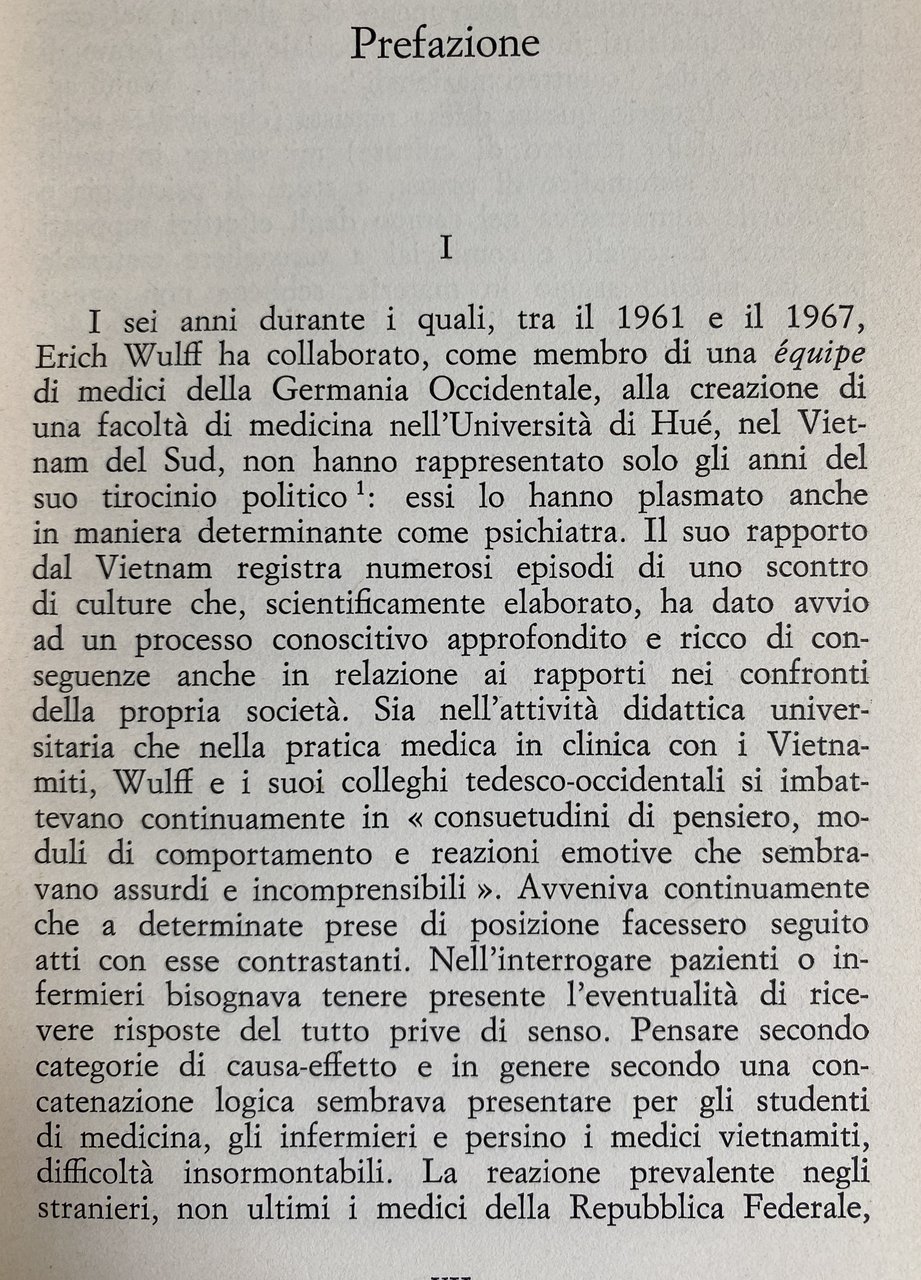 Erich Wulff propone, sulla base di una lunga esperienza di lavoro negli ospedali psichiatrici vietnamiti durante l'aggressione americana, una radicale revisione critica di alcuni concetti fondamentali della psichiatria, e una nuova considerazione dei suoi risvolti sociali. Oltre che Rapporto psichiatrico dal Vietnam, a questa fondamentale esperienza professionale e umana si richiamano altri contributi di etnopsichiatria, tutti di grande rilievo, nei quali si mette a nudo l'inconsistenza di molti tra i dogmi fondamentali della medicina occidentale, e il loro condizionamento culturale: Problemi fondamentali della psichiatria transculturale; Il cambiamento di cultura come problema psichiatrico; Le barriere linguistiche come ostacolo nella ricerca psichiatrica. Ad una tematica differente, ma anch'essa costantemente attenta ai nessi tra privato e sociale si rifanno: Il medico e il denaro. Influsso dei sistemi di pagamento sul rapporto medico-paziente; La psicosi come atteggiamento tossicomanico; La psicoanalisi scienza di potere? Psicopatia?-Sociopatia?