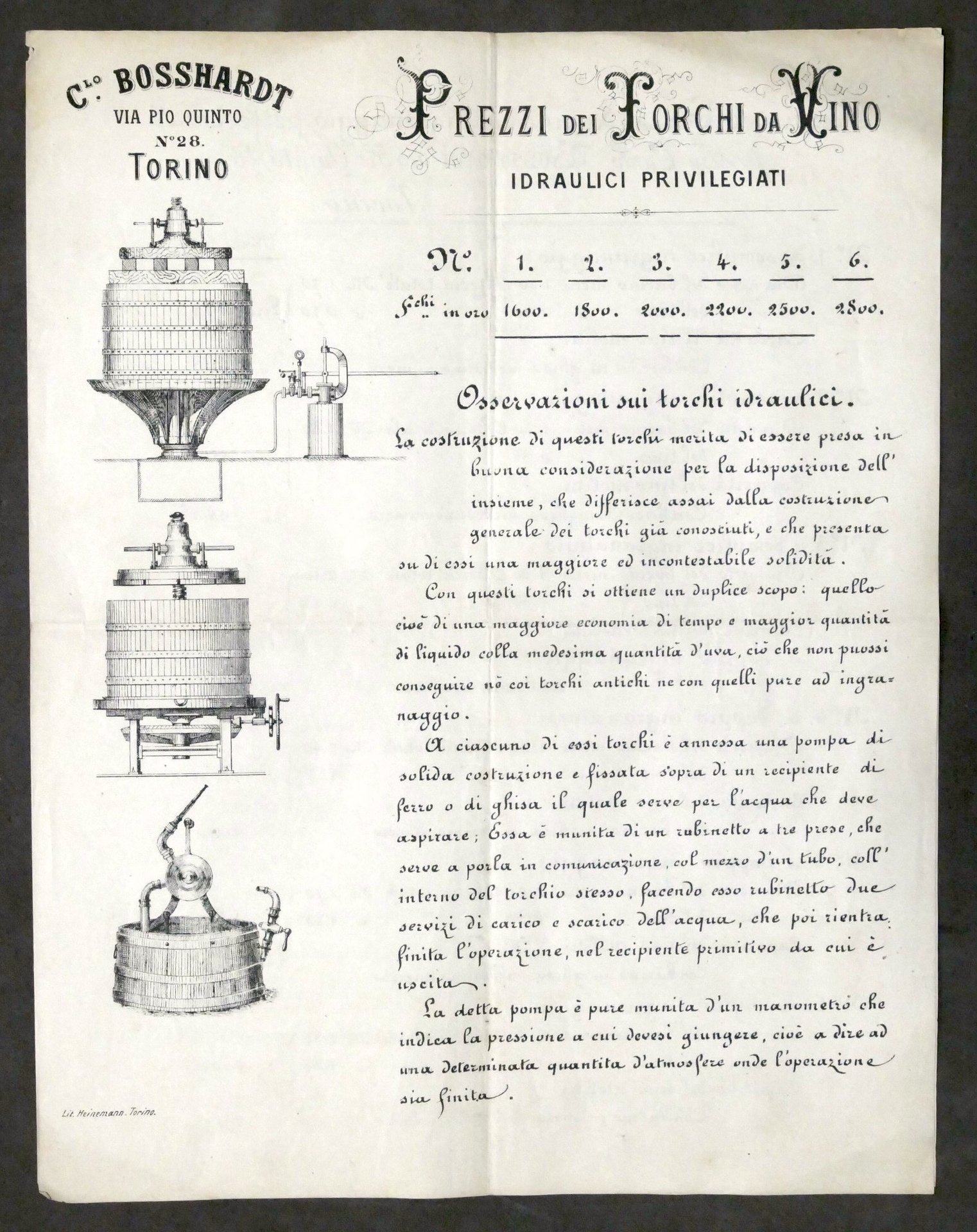 Pubblicità - C. Bosshardt - Torino - Prezzi dei Torchi da Vino idraulici - 1876