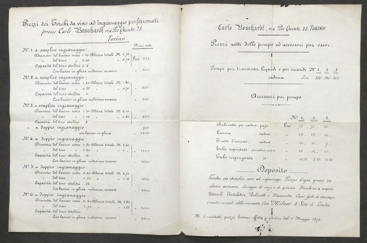 Pubblicità - C. Bosshardt - Torino - Prezzi dei Torchi da Vino idraulici - 1876 Pag. 3 - Lingua italiana. Dimensioni: 22 x 28 cm ca. Condizioni generali buone. Piccoli segni del tempo. Â