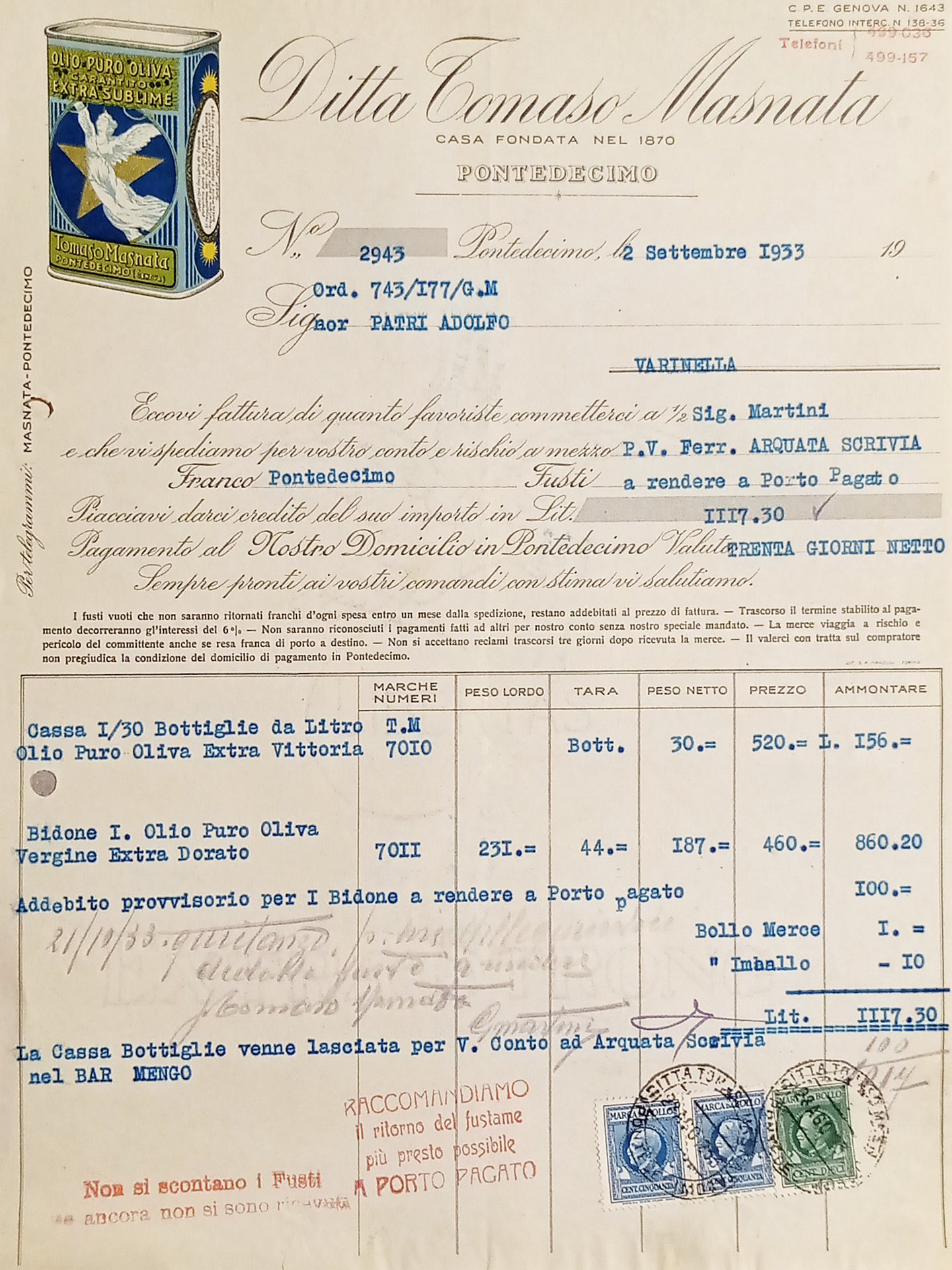 Pubblicità - Fattura - Ditta Tomaso Masnata - Olio Puro Oliva - Pontedecimo 1933