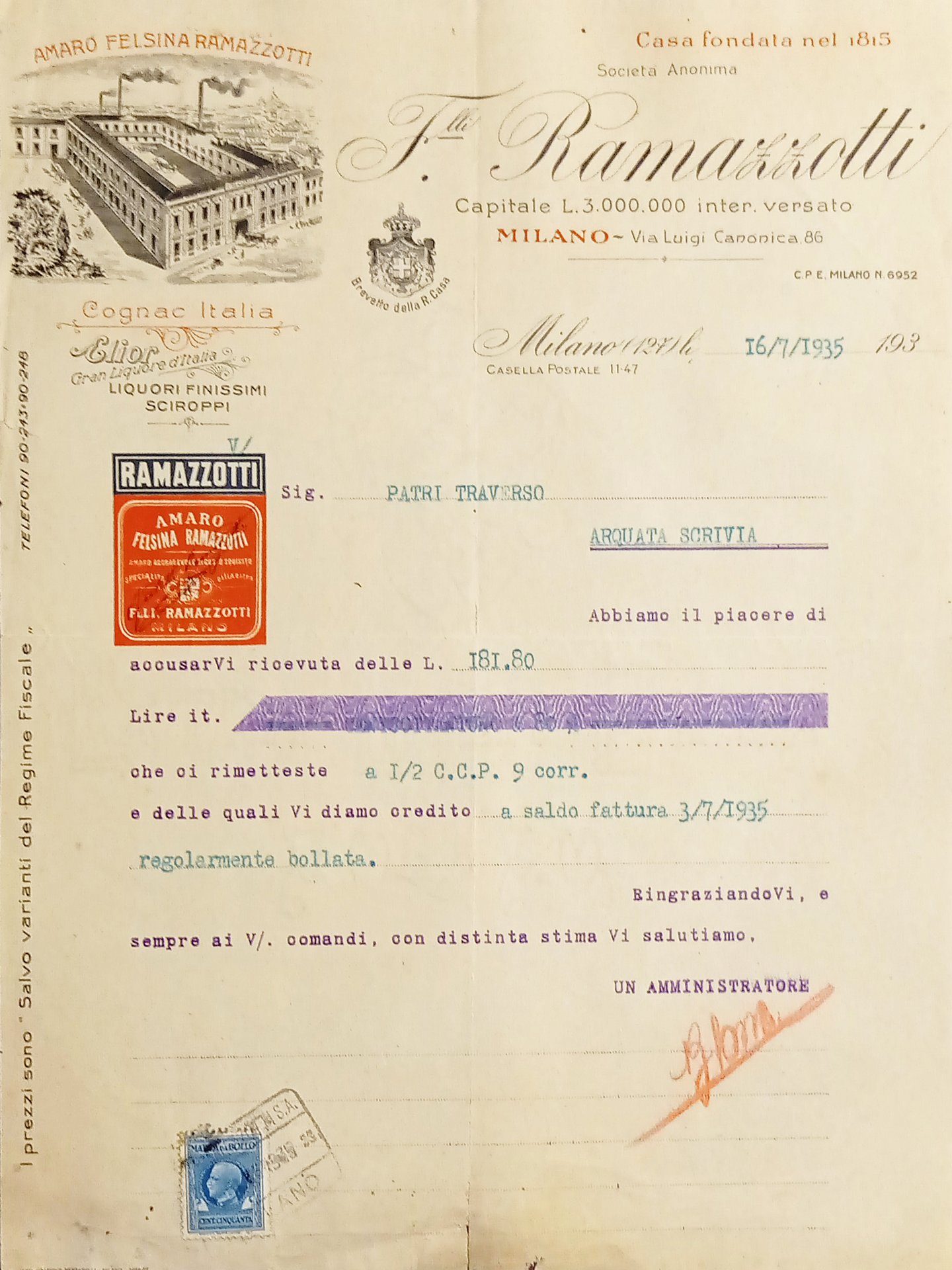 Pubblicità - Fattura - Società Fratelli Ramazzotti - Amaro Felsina - Milano 1935 Un foglio, dimensioni: 29 x 23 cm ca. Lingua italiana. Condizioni buone.