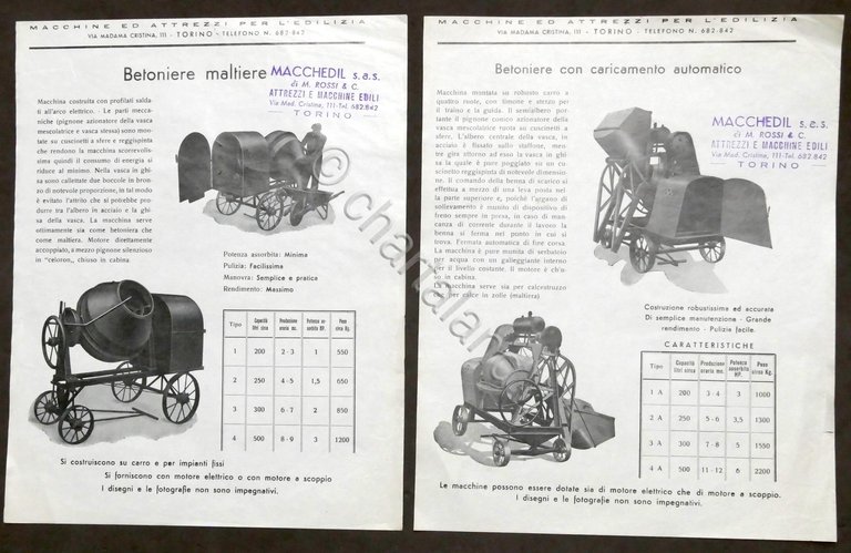 Pubblicità, - Lotto 2 Brochure Macchedil - Torino - Betoniere con caricamento automatico / Betoniere maltiere - anni '50