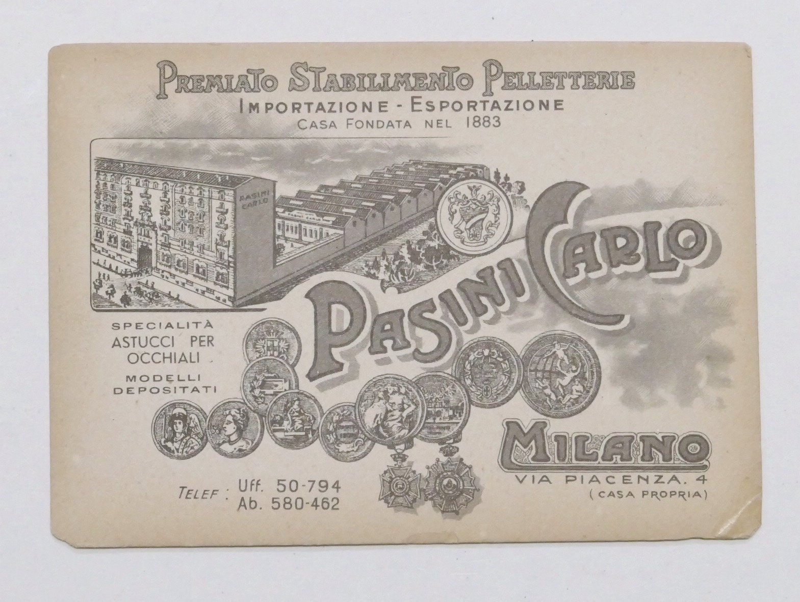 Pubblicità - Premiato Stabilimento Pelletterie Pasini Carlo - Milano - 1930 ca. Dimensioni cartoncino: 9,5 x 13,5 cm Condizioni buone.