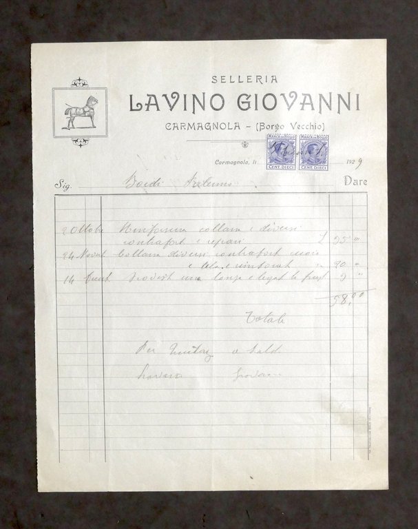 Pubblicità - Selleria Lavino Giovanni - Carmagnola - Fattura Dicembre 1929 Dimensioni foglio: 22 x 28 cm ca. Condizioni molto buone.