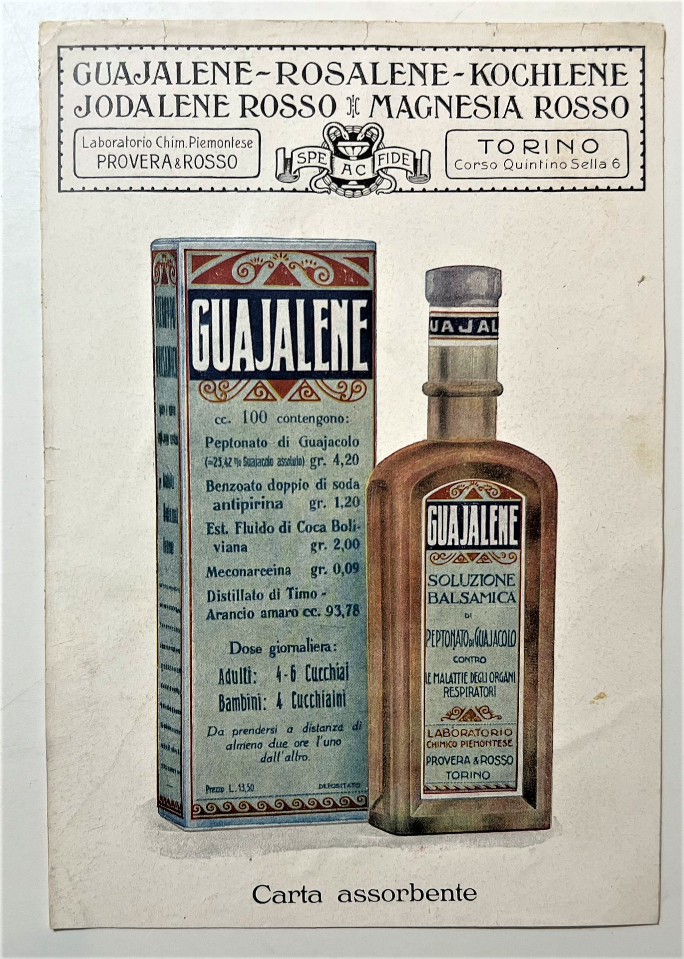 Pubblicità - Guajalene - Laboratorio Chimico Piemontese Provera & Rosso, Torino - Primi 900 Testo in lingua italiana. Dimensioni 21.5 x 15 cm Condizioni molto buone con piccoli segni del tempo come da foto.