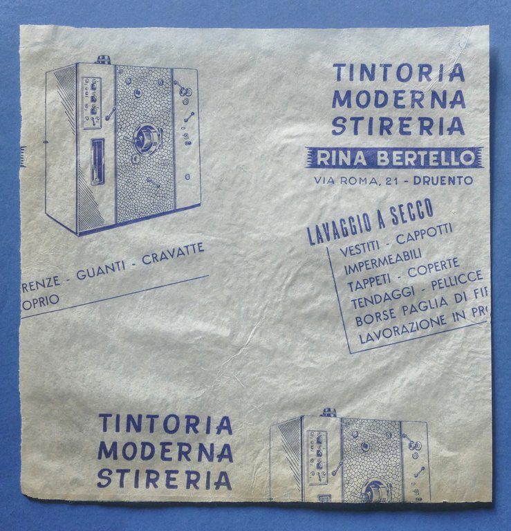 Pubblicità Carta confezione Tintoria Moderna Stireria Rina Bertello - Druento (TO) Dimensioni: 25 x 25 cm ca. Condizioni molto buone. Â