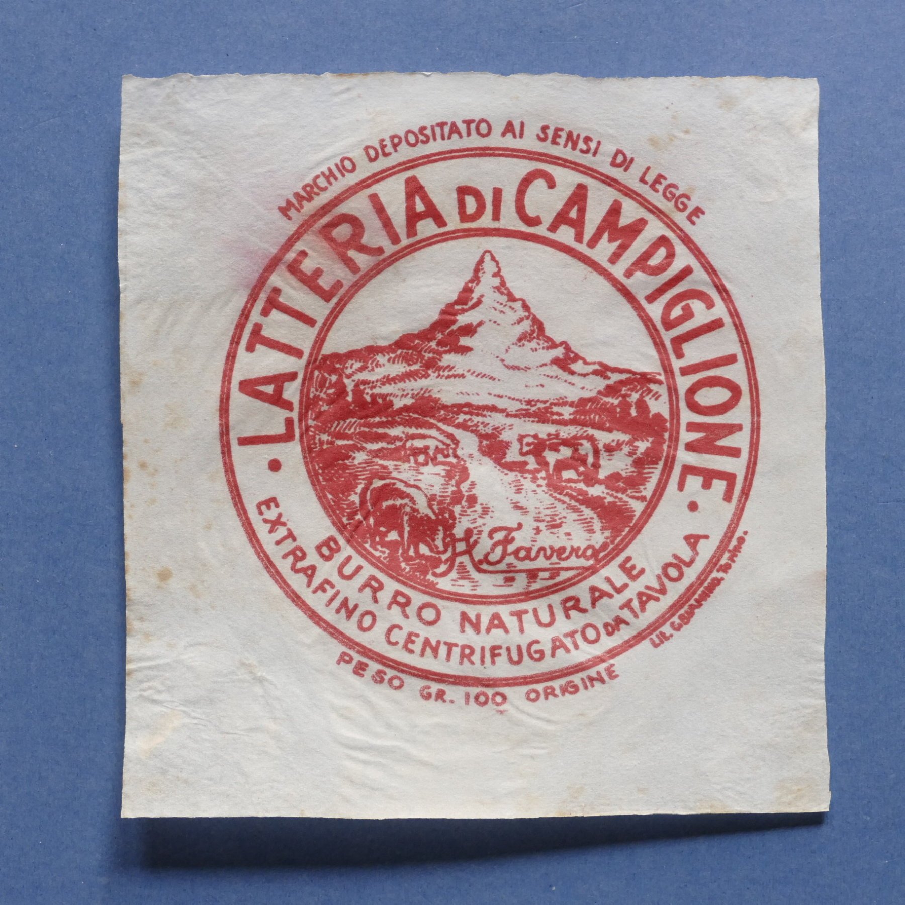 Pubblicità  alimentari Carta confezione etichetta epoca Burro Latteria di Campiglione Dimensioni: 11 x 12 cm ca. Condizioni buone.