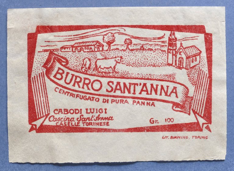 Pubblicità alimentari Carta confezione etichetta epoca - Burro Sant'Anna - Cabodi Luigi - Cacina Sant'Anna - Caselle Torinese Dimensioni: 8 x 11 cm ca. Condizioni molto buone. Â