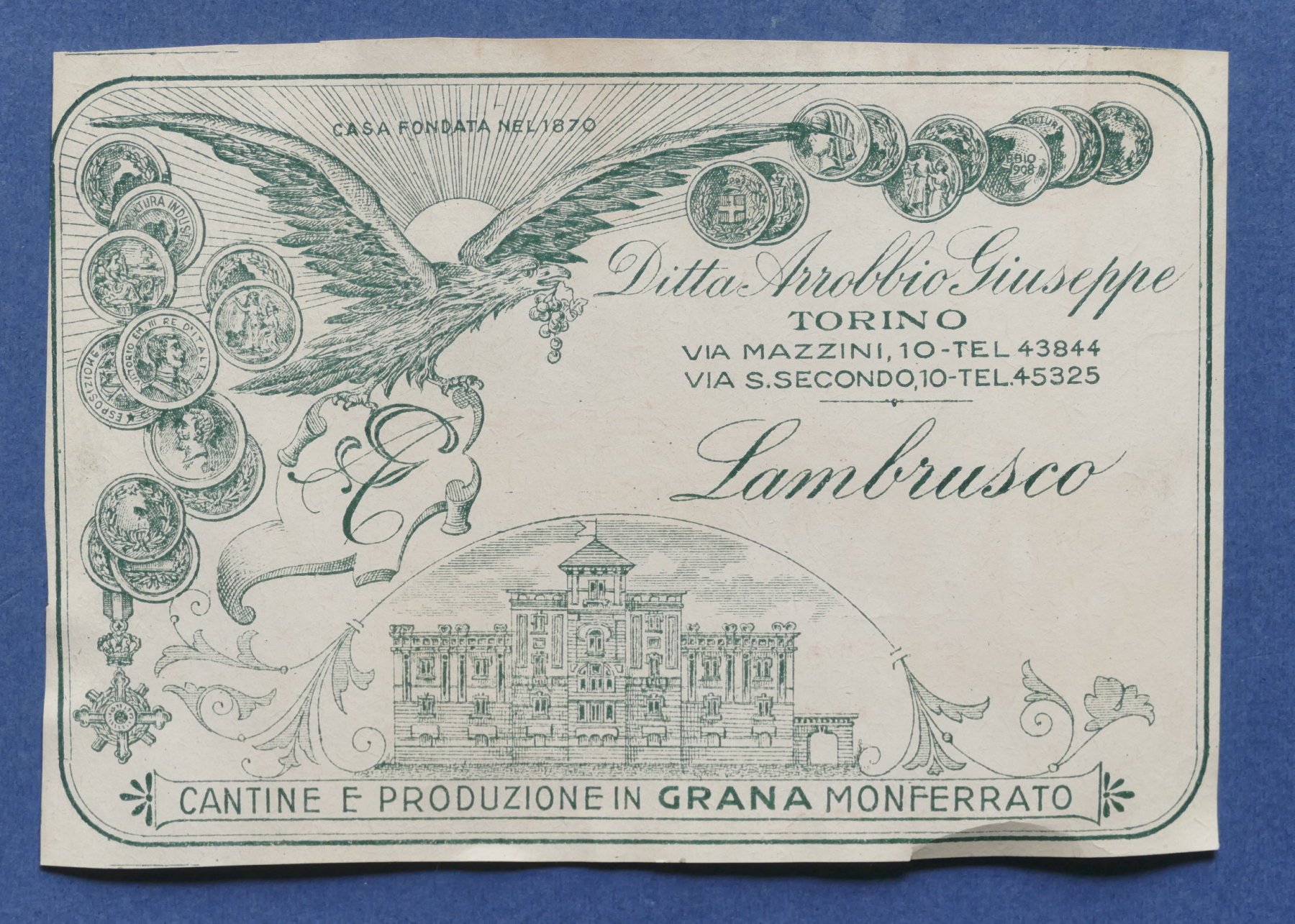 Pubblicità Etichetta epoca vino Lambrusco Ditta Arrobbio - Grana Monferrato