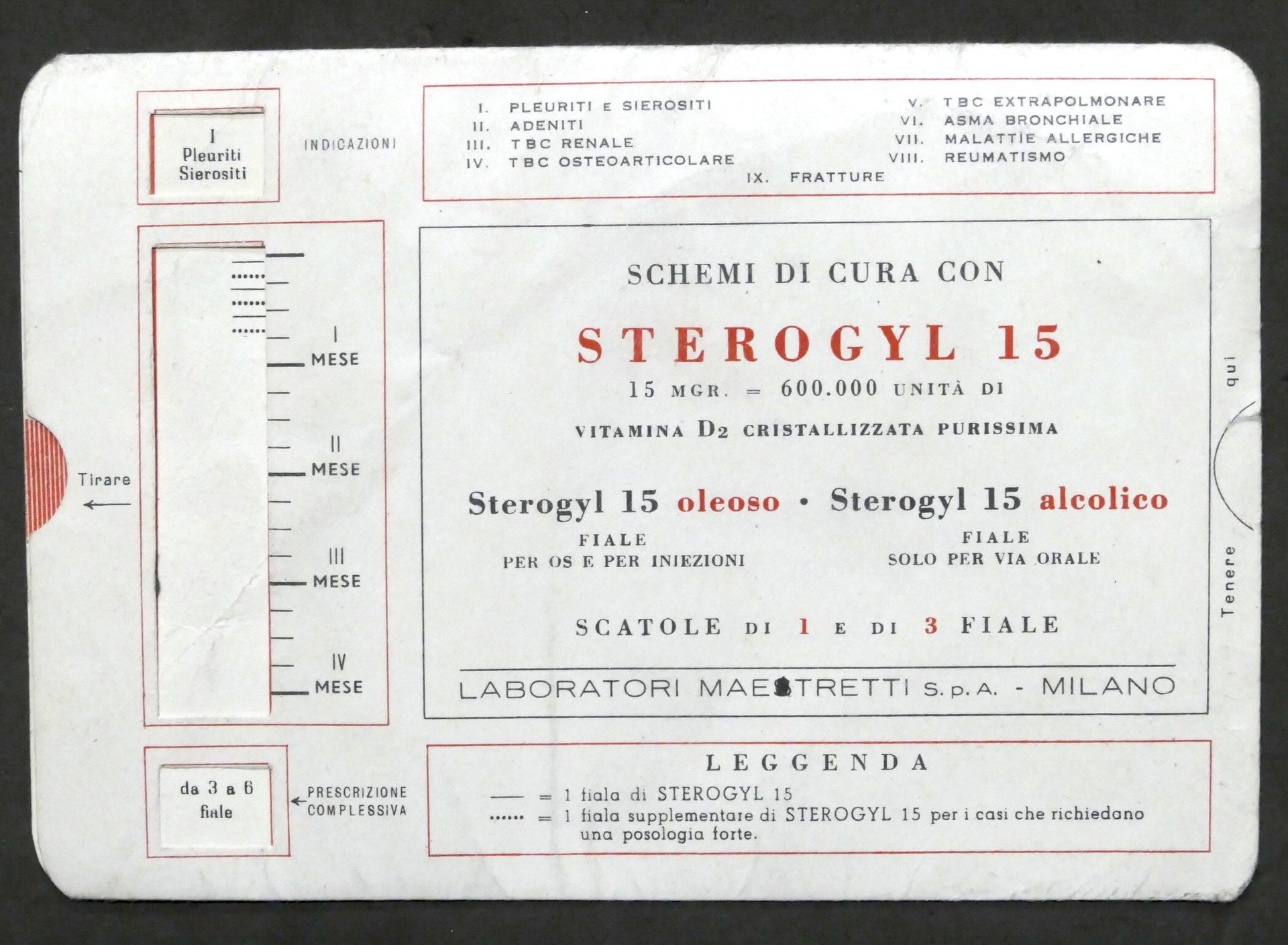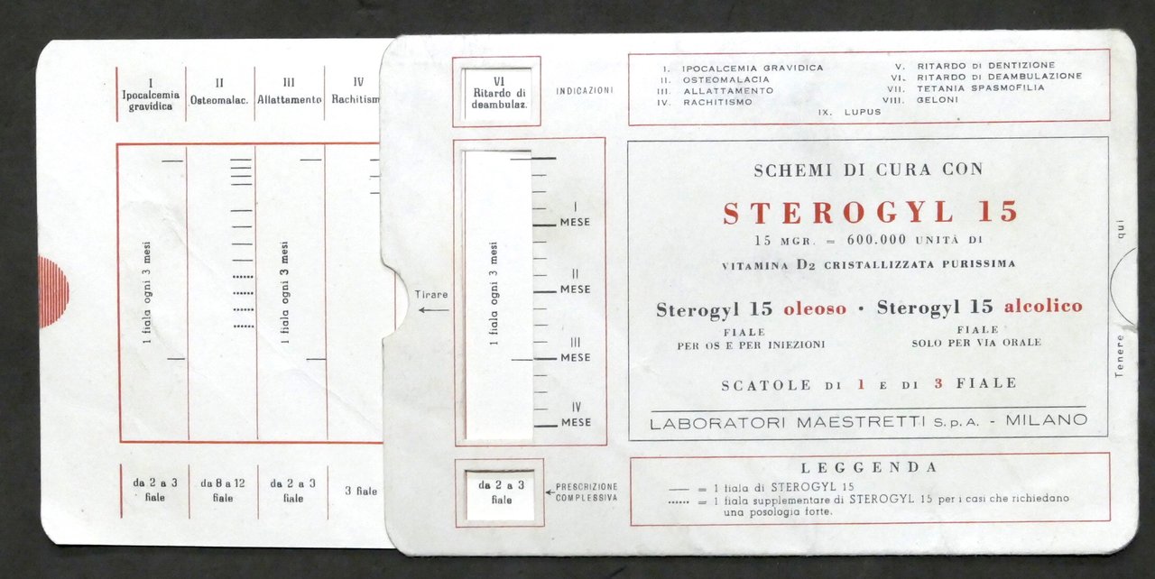 Pubblicità farmaceutica Sterogyl 15 (Laboratori Maestretti, Milano) Regolo calcolatore schemi di cura Dimensioni: 11 x 15 cm ca. Condizioni generali buone. Qualche lieve piega.