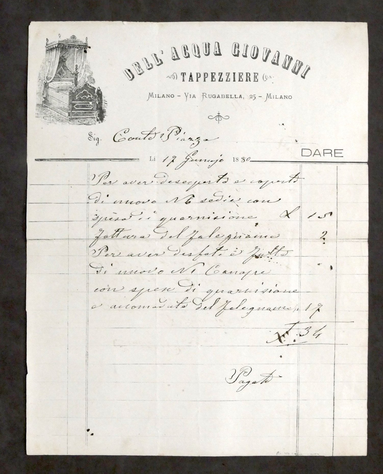 Pubblicità Fattura - Dell'Acqua Giovanni - Tappezziere - Milano - 1880