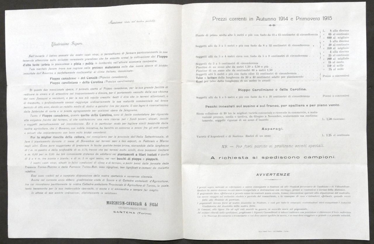 Pubblicità Ditta Marchesin Cavaglià & Figli vivaisti - Santena (Torino) - Listino prezzi Piante - 1914 / 1915 Pag. 4 - Testo in italiano. Dimensioni: 22 x 28 cm ca. Condizioni generali buone. Â