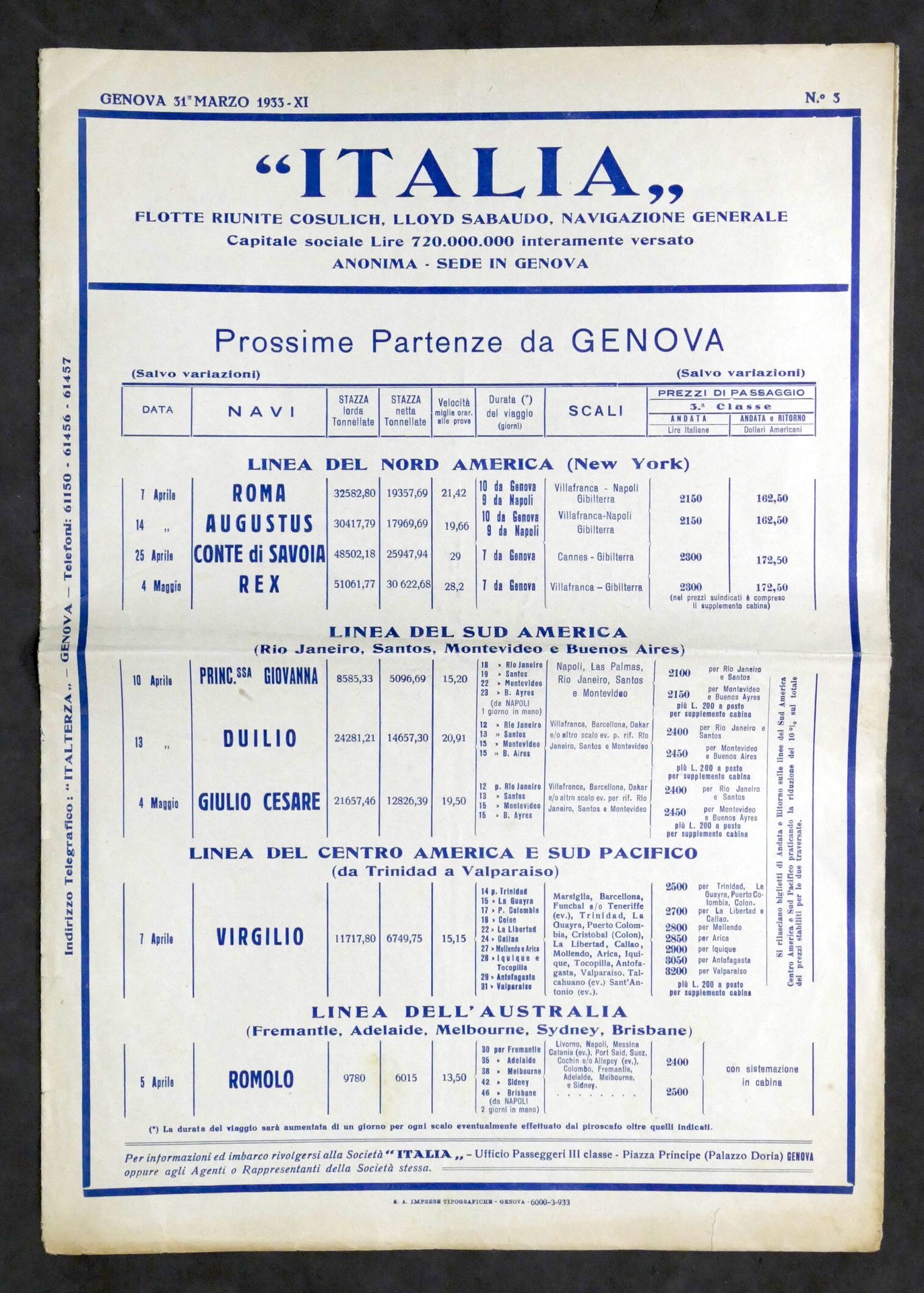 Pubblicità - Società Italia - Flotte Riunite Cosulich, LLoyd Sabaudo, Navigazione Generale - Partenze da Genova per Americhe e Australia - Marzo 1933 Pag. 6: listino prezzi e norme per i passeggeri. Condizioni buone. Piccoli segni del tempo.