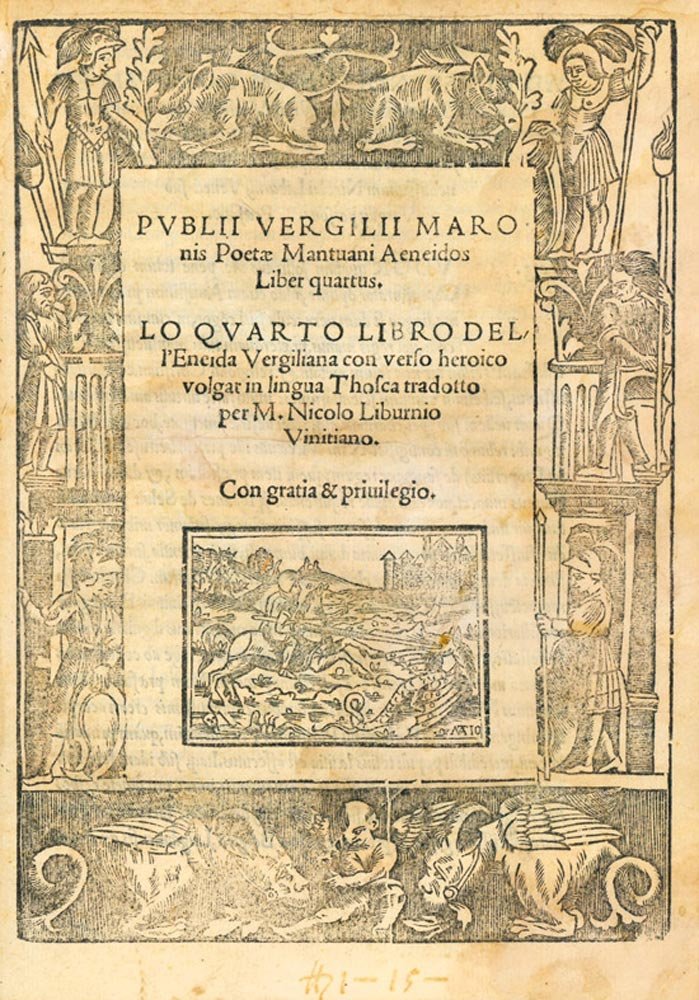 Prima edizione.Esemplare molto buono (qualche lieve brunitura).Celebre traduzione in endecasillabi sciolti del quarto libro dell’Eneide ad opera dell’umanista friulano Nicola Liburnio, una delle prima realizzate nel Cinquecento, tra le pochissime a presentare il testo latino a fronte: «Liburnio sceglie di sfidare a viso aperto Virgilio, stampando a fronte il testo latino, prassi assai poco consueta nella traduzione cinquecentesca», scelta che conduce a importanti considerazioni sulla ricezione dell’opera: «È chiaro che un’operazione di questo tipo rivela anche la vocazione ad un pubblico scaltrito, che si avvicina al IV libro dell’Eneide non certo, o non solo, per godersi un dramma d’amore e di morte. Il lettore della traduzione liburniana è in grado di confrontare il latino col volgare (la fatica dell’umanista friulano è dedicata, per sua stessa ammissione, ai “gentil huomini de le corti”) e di seguire verso a verso la resa. Non è però nemmeno il letterato, capace di leggere il testo virgiliano in lingua originale: l’opera di Liburnio, dunque, si appella ad una nuova categoria di lettori, quella “mezzana”, e si propone di innalzare un poco il livello della fruizione del testo, abbandonando i rifacimenti e i volgarizzamenti dei cantari di materia virgiliana per tentare un’operazione più matura e complessa» (S. Vergot, «“Nec converti ut interpres, sed ut orator”: quattro esperimenti di traduzione del IV libro dell'Eneide nel Cinquecento», Tesi di laurea magistrale, Padova, 2016, pp. 29-30). -- Edizione rara, solo 6 copie censite in Opac Sbn.