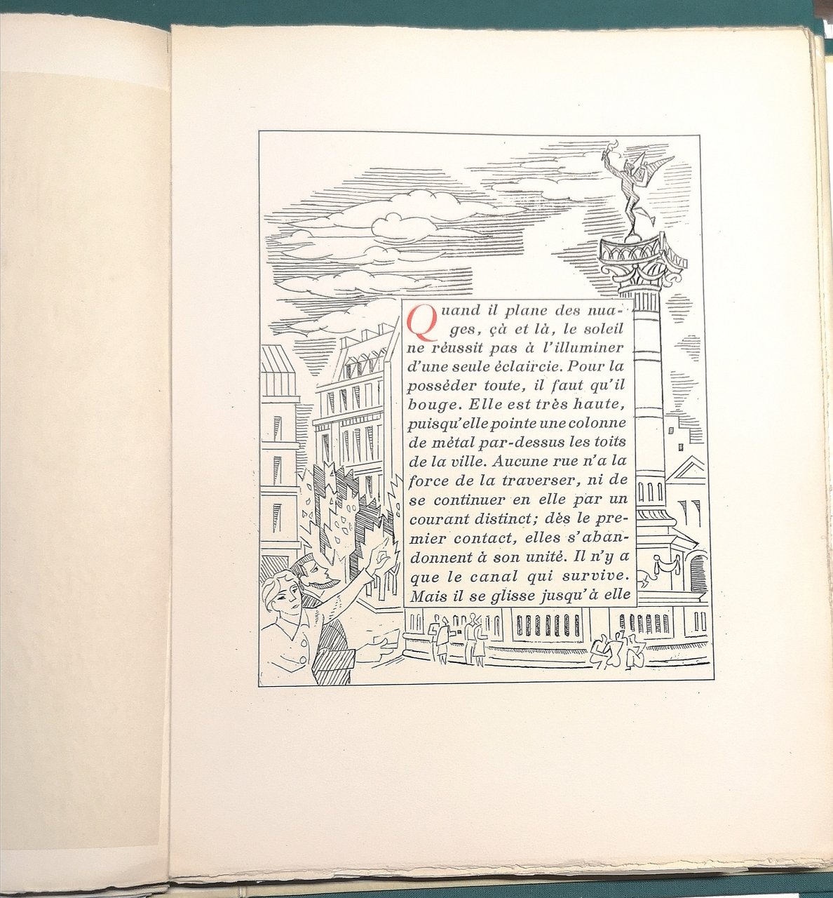 >in-4 grande, pp. 121, (6) di Table de Matières e colophon, (8) di presentazioni editoriali de Les Bibliophiles du Palais; 18 acqueforti originali protette da velina, il tutto in quaderni sciolti. Coperta edit., camicia in cart. con titolo in rosso al dorso, astuccio. Edizione di pregio, tirata in 200 esemplari numerati impressi su vélin du Marais (n. 168, imprimé pour M. Pierre Widal). Perfetto esemplare.