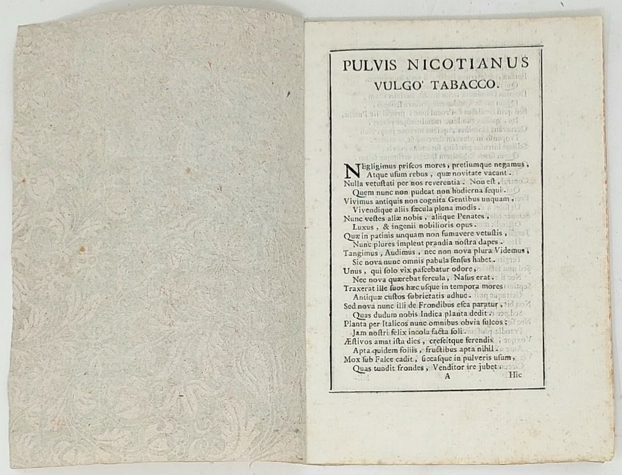 >in-4, cc. 4 non numerate, brochure coeva azzurrina, testo riquadrato in ogni pagina. Il nome dell'A. in fine, Cleogenes Naxius, è lo pseudonimo arcadico di Francesco Maria Della Volpe (cfr. A.M. Giorgetti Vichi, Gli Arcadi dal 1690 al 1800: onomasticon, Roma 1977, p. 58), poeta di origini imolesi. Fu autore, oltre alla presente opera in versi elegiaci sul tabacco, di versi dedicati al cioccolato. Opuscolo raro a trovarsi, fresco, ad ampi margini.
