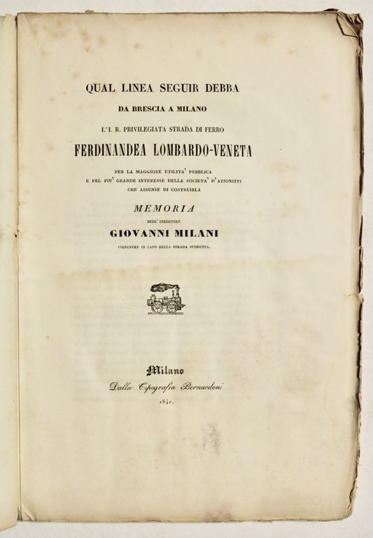 Qual linea seguir debba da Brescia a Milano l'I. R. privilegiata strada di ferro Ferdinandea Lombardo-Veneta.Memoria dell'Ingegnere Giovanni Milani. Milano, Bernardoni, 1840. In 4° (270x180; pagg. 80 con una carta top