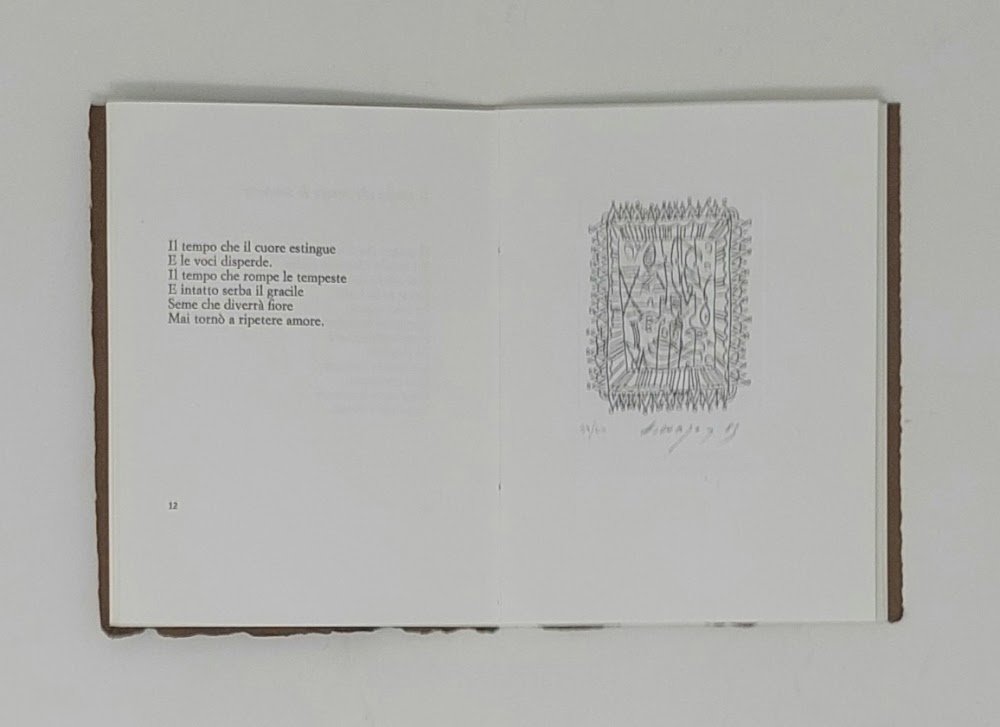 >in-12 (137x103 mm), pp. 21, (7). Legatura cucita a mano con singolo punto, coperta in carta tagliata a mano, titolo in nero al piatto anteriore. Edizione d'arte, a cura di Giorgio Lucini, con nota di Luigi Cavallo, poesie di Raffaele Carrieri e tre incisioni all'acquaforte di Alberto Longoni, ciascuna con firma e numerazione al lapis. Impresso in 60 esemplari fuori commercio (ns. 39). Entro custodia cartonata. Perfetto esemplare.
