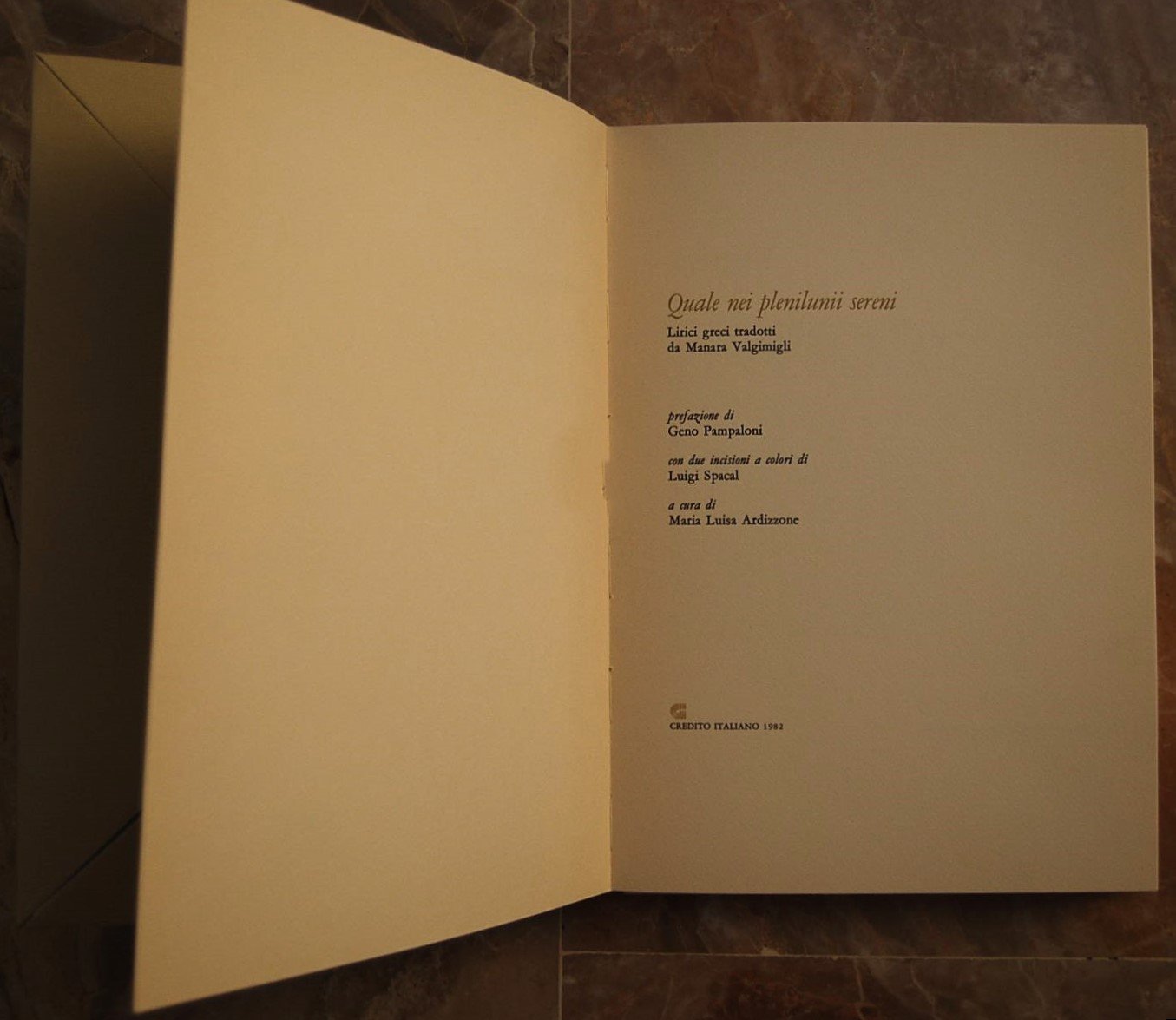 Credito Italiano, 1982. In-4, brossura, astuccio, pp. 144, con 2 xilografie di Luigi Spacal, firmate e numerate. Lirici greci tradotti da Manara Valgimigli. Edizione numerata di 150 esemplari. In ottimo stato.