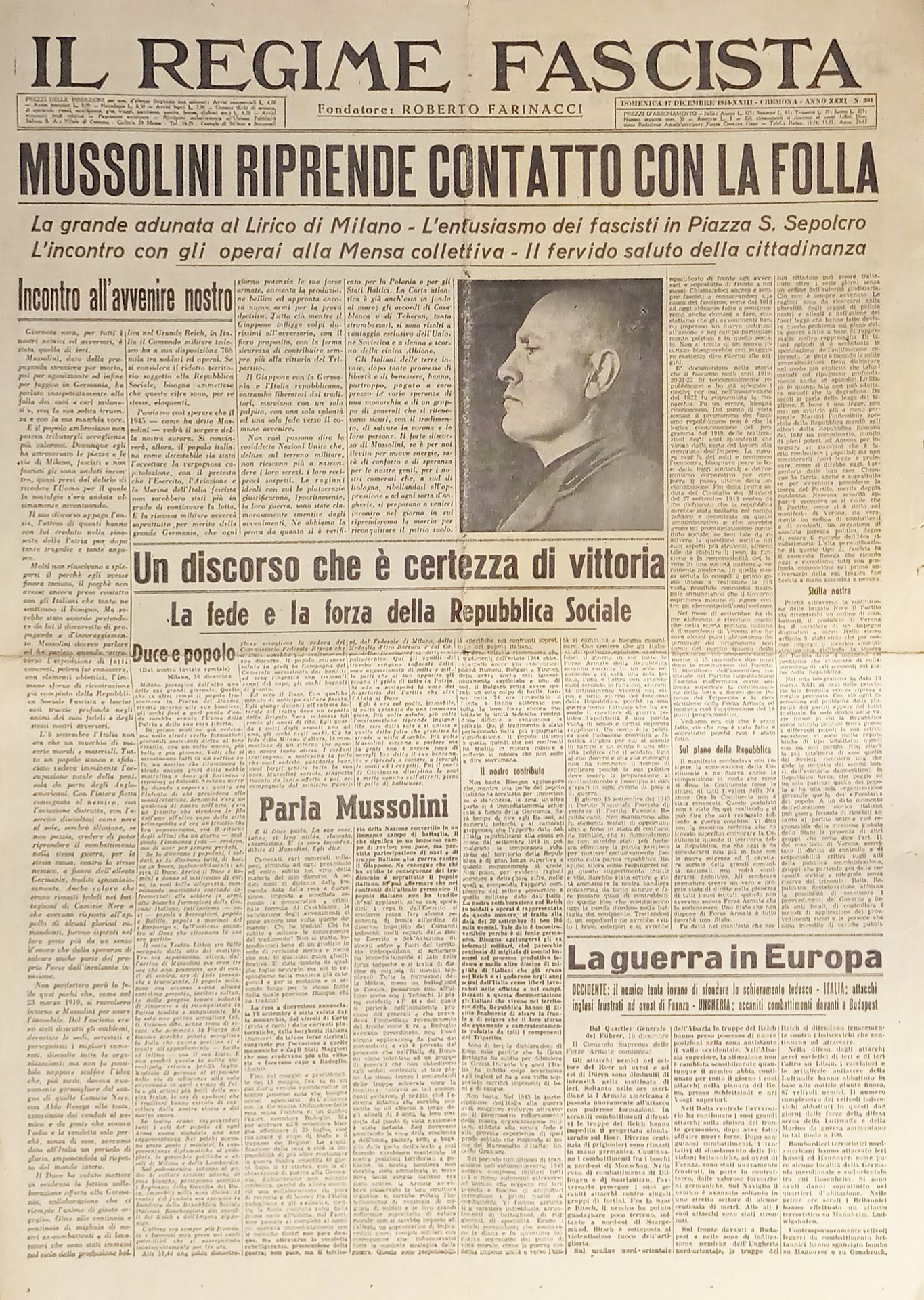 Quotidiano Il Regime Fascista n.301 - 1944 Mussolini riprende contatto con folla