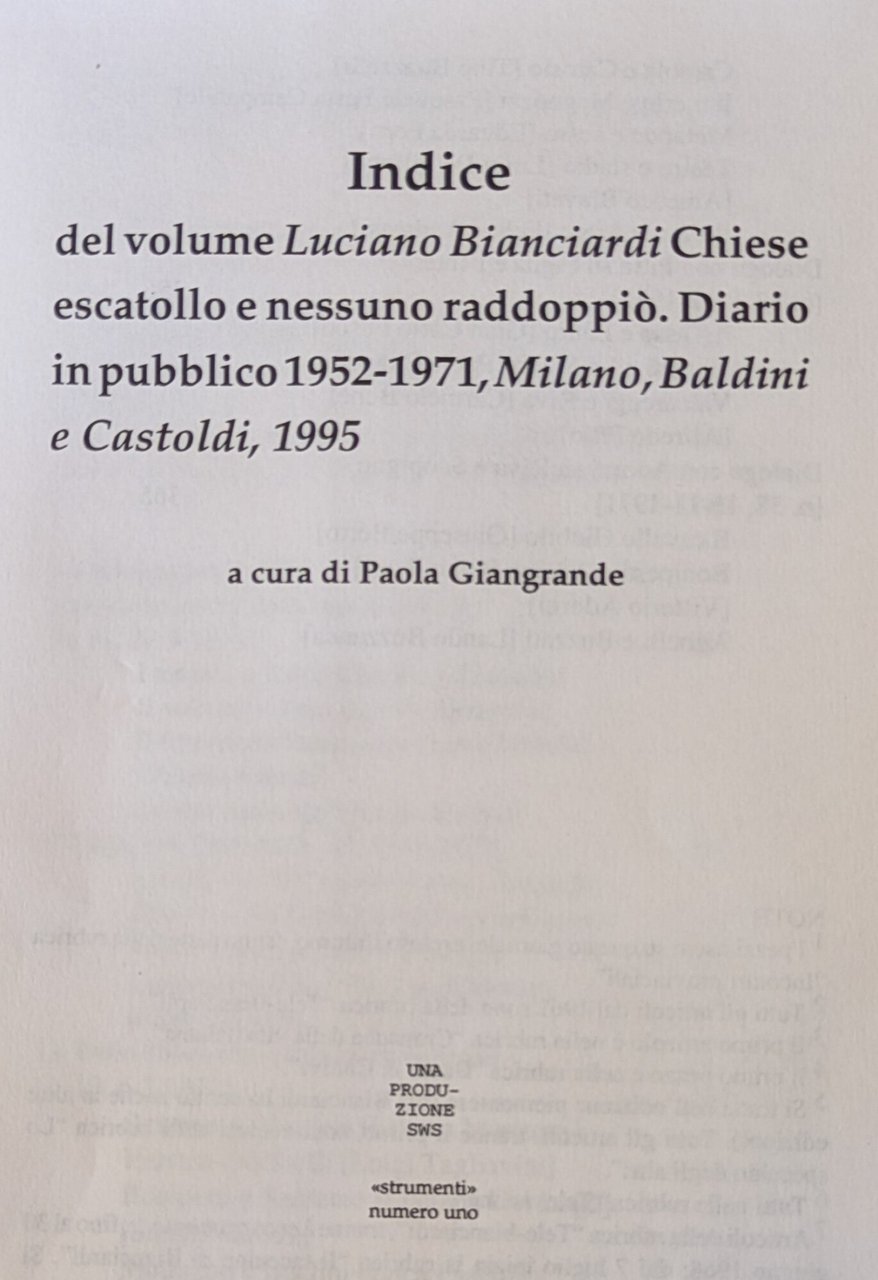 Indice del volume "Luciano Bianciardi, Chiese escatollo e nessuno raddoppiò, Baldini e Castoldi 1995", a cura di Paola Giangrande, 1997;