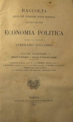 VOLUME TREDICESIMO: Gustavo Schonberg - Manuale di economia politica (Continuazione) - in 8° - pp.1294 - Mezza pelle con titolo in oro al dorso - Abrasioni alla legatura. Tela staccata ai piatti da umido. Fioriture sparse