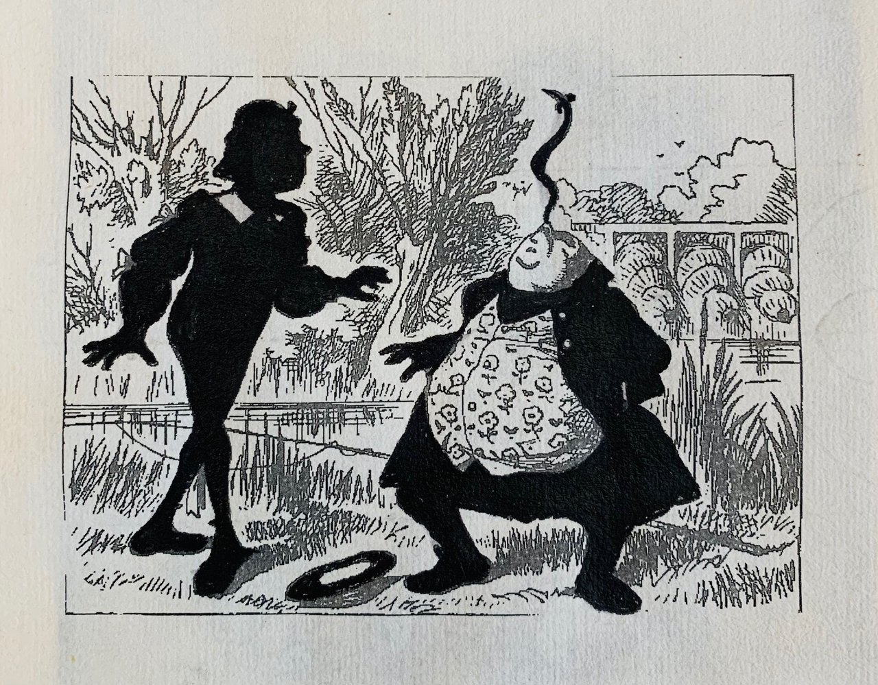 >13 composizioni di 140 x 200 mm ciascuna (pass partout 54x43 cm). Serigrafie di fine XIX secolo tratte dalle incisioni originali di Tenniel, realizzate per "Alice nel Paese delle Meraviglie" (1865), sulle quali sono stati eseguiti interventi con inchiostro di china. Sir John Tenniel artista britannico, celebre illustratore del XIX secolo divenne famoso grazie alla collaborazione con Lewis Carroll per "Alice nel Paese delle Meraviglie". L'illustratore riteneva che le creature di "Alice" non dovessero sembrare animali veri, ma piuttosto creature inventate (Stregatto, Dodo, Cappellaio matto, Leprotto Marzolino, Bianconiglio...). Raccolta di silhouettes (sagome nere su fondo bianco, che ricordano delle ombre proiettate su un muro). Il termine deriva dal ministro delle finanze di Luigi XV Etienne de Silhouette e indica qualcosa di sottile, di magro, come la nota parsimonia del ministro. Esemplare unico realizzato a mano da artista di inizio Novecento.
