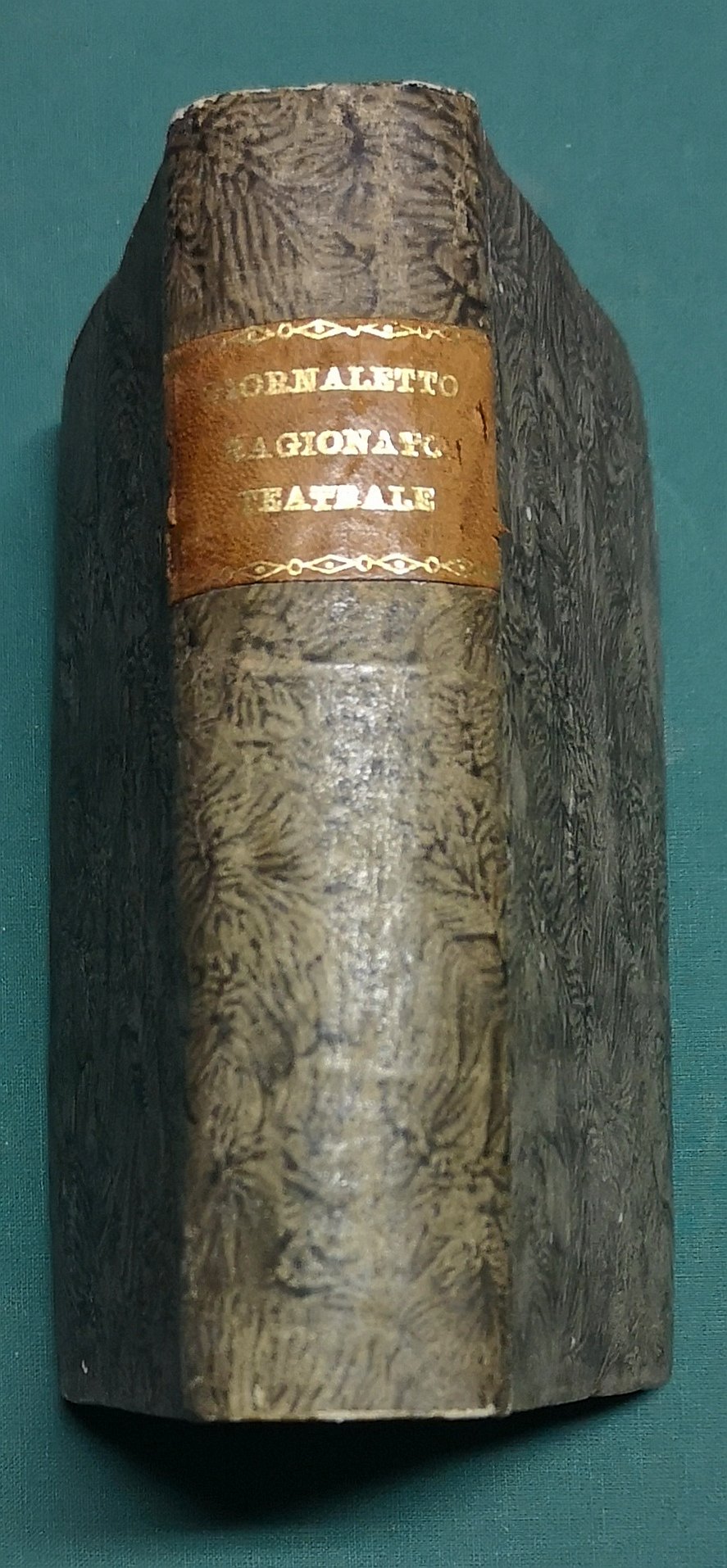>in-16, pp. 571, (1), leg. in carta con tassello con tit. oro al dorso. Raccolta di 84 fascicoli della rivista Giornaletto Ragionato Teatrale, riportanti notizie sugli avvenimenti e spettacoli, commedie, tragedie e melodrammi, dei vari teatri italiani (La Fenice, La Scala, Del Sole, etc. etc.). Bell'esempl.