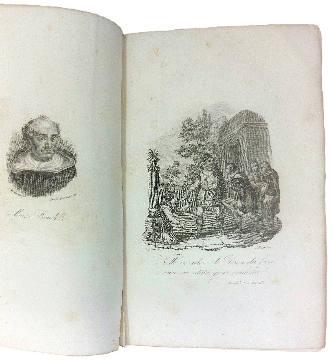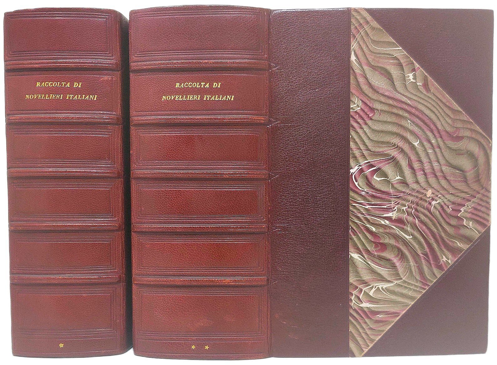 >2 volumi in-8, pp. (6), XIV, (4), 1104; (4), 1104-2502, XV-XLVII (di indice), bella legatura moderna in mezzo marocchino ed angoli, titolo in oro su dorso a nervi, tagli dorati. Illustrati da 9 ritratti e 6 tavole incise f.t. Importante e vastissima raccolta di novellieri italiani. Nella prima parte: Novelle del Bandello. I diporti del Parabosco. Le sei giornate dell' Erizzo. Novelle del de' Mori. Novelle di alcuni autori fiorentini: Novella di anonimo. L. Pulci. N. Machiavelli. L. Alamanni. A. Firenzuola. A.F. Doni. Salvuccio Salvucci. L. Magalotti. Gio. Bottari. Nella seconda parte: Novelle di alcuni autori senesi: Gentile Sermini. P. Fortini. M.B. Ilicini. Nelli. Scipione Bargagli. Sozzini. M. Bandiera. Il percorone di Ser Giovanni Fiorentio. Le cene del Lasca. Novelle di Franco Sacchetti. Gli ecatommiti de Gio. Battisia Giraldi. Il decameron di Messer Giovanni Boccaccio. Opera rara a reperirsi in commercio e in buono stato poiché un gran numero di esemplari andarono persi nell'inondazione di Firenze del 1844; fa parte della ''Biblioteca del viaggiatore'', raccolta di classici della letteratura italiana divisa in sei volumi di cui il presente è il tomo quinto diviso in due parti. Ottimo esemplare, fresco e ad ampi margini. Papanti, Novellieri italiani, p. 58. Manca a Passano.