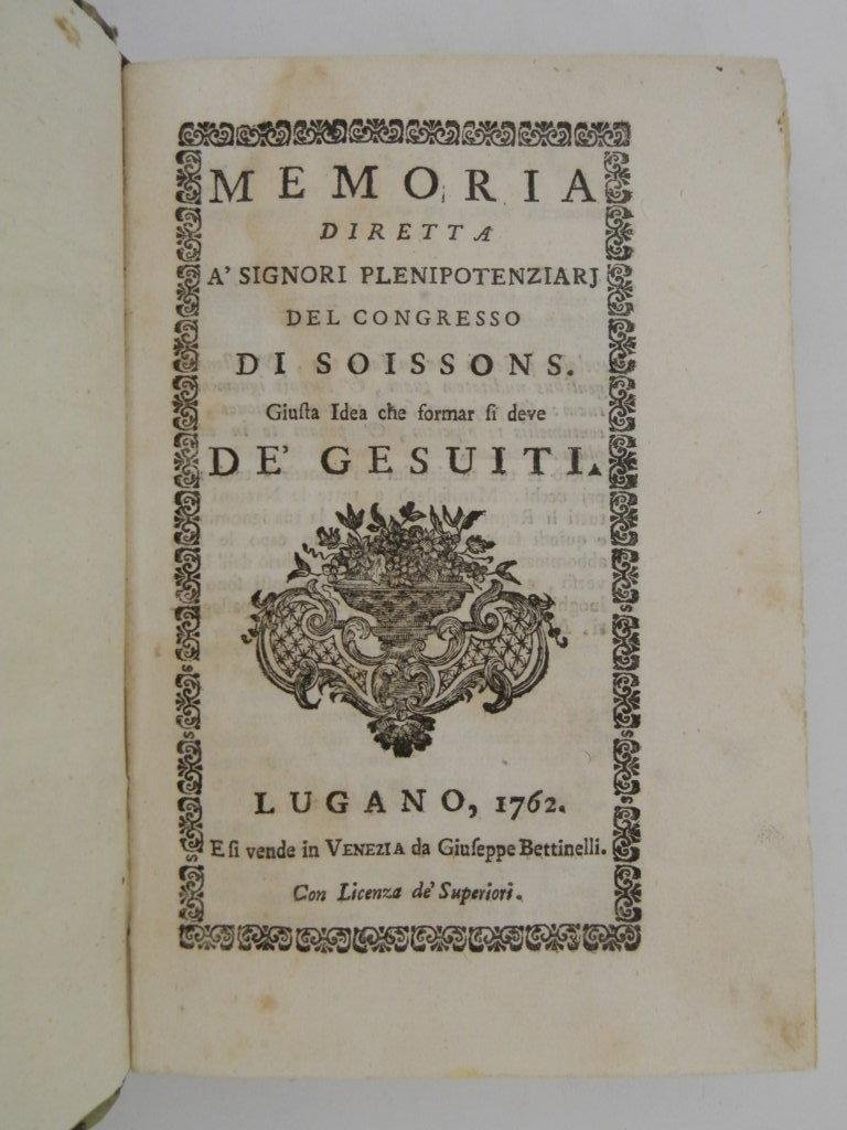 6 fascicoli in un volume, pp.56; XVI, XVI; (16); 112; 46; (73), una tavola ripiegata fuori testo. Memoria diretta a' signori plenipotenziari del congresso di Soissons, giusta idea che formar si deve de' gesuiti. Legge di S. M. F. Il Re di Portogallo con cui si ordina la proscrizione, ed espulzione de' religioni della Compagnia denominata di Gesù da tutti i suoi regni, e domini. Prammatica sanzione di sua maestà cattolica con forza di legge per l'espulsione dei gesuiti da tutti i suoi domini. Ragionamento d'uno de' signori delle inchieste al parlamento sendo tutte le Camere radunate, intorno le costituzioni de' Gesuiti recitato il 17 aprile 1761. Dissertazione epistolare di un suddito veneto con cui si dimostra ch'è necessaria la soppressione de' Gesuiti. Ristretto del processo e sentenza emanata contro l'infrascritti rei, per l'orrendo assassinio macchinato ed eseguito contro la Sagra persona di Sua Maestà Fedelissima Giuseppe I Re di Portogallo la notte del giorno 3 settembre 1758. Infine un capitolo di un libro sui gesuiti in forma di lettera. Rilegatura coeva in cartone rustico ricoperto da carta marmorizzata, esemplare nell'assieme molto buono. *** TUTTI I NOSTRI LIBRI SONO VISIBILI PREVIO CONTATTO MAIL O TELEFONO NELLA NUOVA SEDE DI MILANO: LIBRERIA COSMOPOLIS, VIA JOMMELLI, 22. ***