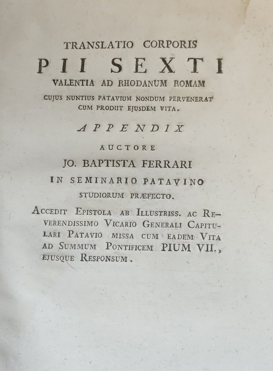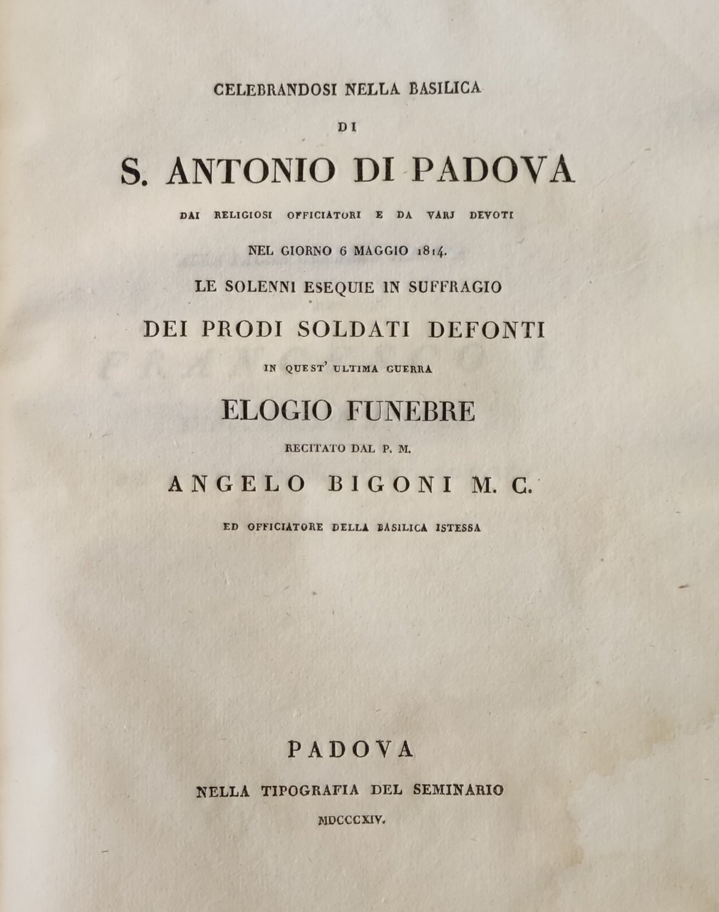Raccolta di quattro opere edite a Padova: FRANSCESCO SCIP. VESCOVO DI PADOVA, ISTRUZIONE PASTORALE SOPRA LI CIMITERJ, Tip. Seminario, 1809. ANGELO BIGONI M.C., CELEBRANDOSI NELLA BASILICA DI S. ANTONIO DI PADOVA (...) LE SOLENNI ESEQUIIE IN SUFFRAGIO DEI PRODI SOLDATI DEFONTI, Tip. Seminario, 1814. PRO FUNERE INSTURATO VIRI CLARISSIMI L.M.A. CALDANI BONONIENSIS ORTIUNCULA HABITA PARTAVII (...), Crescini, 1816. PARENTALIBUS PII SEXTI PONTIFICIS OPTIMI MAXIMI ORATIO AD EMINENTISSIMO (...) S.R.E. CARDINALES A CAESARE BRANCADORO (...) HABITA VENETIIS IN PATRIARCHALI BASILICA, 1799, Tip. Seminario.