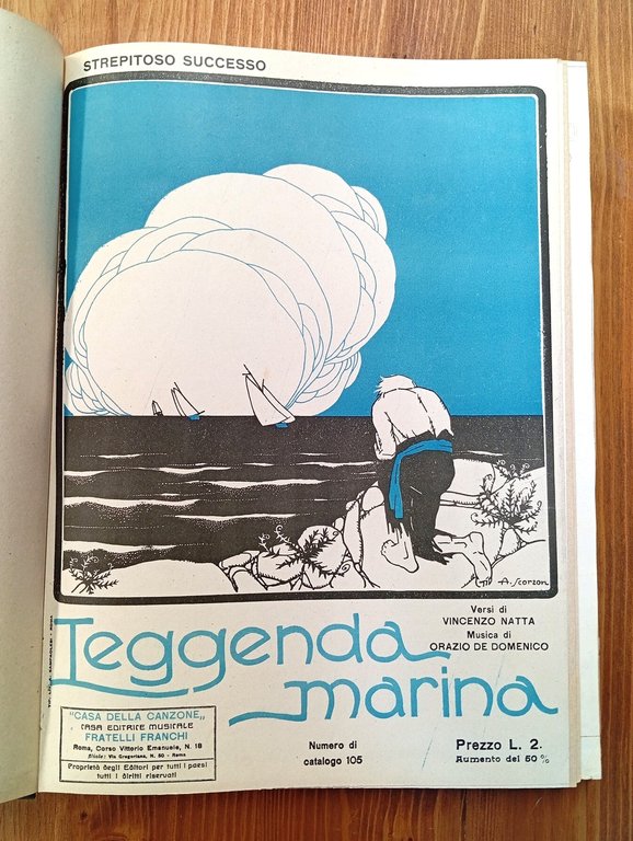 Volume in tela amatoriale verde scuro contenente un'ampia selezione di partiture musicali, stampate intorno ai primi del Novecento, complete delle loro splendide copertine illustrate. Si tratta di canzoni della scuola napoletana - spesso presentate al famoso festival di Piedigrotta -, diverse delle quali a firma di E. A. Mario, pseudonimo di Giovanni Ermete Gaeta, compositore e paroliere napoletano. La raccolta apparteneva probabilmente a tale Ida Giustiniani, cantante mezzo-soprano, che talvolta si firma ai frontespizi. Nel dettaglio: LEGGENDA MARINA. Verdi di Vincenzo Natta; musica di Orazio De Domenico ("Casa della canzone", ed. mus. Fratelli Franchi, Roma) - ABAT-JOUR. Fox-trot. Versi di Ennio Neri; musica di M. Cobianco; creazione di Anna Fougez (ed. mus. "La canzonetta", Napoli) - PRIMAVERA DI BACI. Versi di Ferraro-Correra; musica di P. E. Fonzo (E. Gennarelli & C., Napoli - CHI SIETE?... Canzonetta. Versi di Tom. De Filippis; musica di Mario Cosentino (G. Santojanni, Napoli, c1917) - VIOLETTA DI PARMA. Versi di C. A. Bixio; musica di A. Fragna (ed. mus. Vedova Ceccoli, Napoli) - LA CHIAMAVANO COSETTA. Versi e musica di C. A. Bixio (ed. Vedova Ceccoli & Figli, Napoli) - COME LA RONDINELLA. Versi e musica di C. A. Bixio (Ed. C.A. Bixio, Napoli) - SEMPLICITA'!.. Versi di T. De Filippis; musica di Attilio Staffelli (G. Santojanni, Napoli, c1921) - BOCCUCCIA D'ORO. Versi di F. M. Russo; musica di F. S. Cataldo (ed. mus. Raffaele Izzo, Napoli, 1918) - HISTOIRES DE POUPEE'. A BROKEN DOLL (Bambola infranta). Paroles françaises de Lucien Boyer; paroles anglaises de Clifford Harris; musique de Jas. W. Tate; versione italiana di Enrico Frati (ed. Francis Salabert, Paris) - SOLDATO IGNOTO. A Gabriele D'Annunzio. Versi e musica di E. A. Mario (ed. mus. E. A. Mario, Napoli, c1921) - L'ARDITO. Versi e musica di E. A. Mario (ed. mus. E. A. Mario, Napoli) - SANTA LUCIA LUNTANA... Versi e musica di E. A. Mario (ed. mus. E. A. Mario, Napoli) - SERENATA A VENEZIA. Versi e musica di E. A. Mario (ed. mus. E. A. Mario, Napoli) - LA CANZONE DI SAMMY (idillio italo-americano). Versi e musica di E. A. Mario (ed. mus. E. A. Mario, Napoli) - ...E SBOCCIANO LE ROSE! Versi e musica di E. A. Mario (ed. mus. E. A. Mario, Napoli) - VIPERA... Creazione di Gabrè; versi e musica di E. A. Mario (ed. mus. E. A. Mario, Napoli) - COLEI CHE SA BACIARE... Versi e musica di E. A. Mario (ed. mus. E. A. Mario, Napoli) - PRIMMAVERA DELIZIOSA. Versi di Alman; musica di E. A. Mario (ed. mus. E. A. Mario, Napoli) - PICCOLE MANI... Versi e musica di E. A. Mario (ed. mus. E. A. Mario, Napoli) - FARFALLA. Piedigrotta 1917. Creazione di Pasquariello; versi e musica di E. A. Mario (ed. mus. E. A. Mario, Napoli) - LE ROSE ROSSE. Versi e musica di E. A. Mario (ed. mus. E. A. Mario, Napoli) - SALUTISSIMI! Versi e musica di E. A. Mario (ed. mus. E. A. Mario, Napoli) - STORNELLI CAMPESTRI. Creazione di Gennaro Pasquariello all'Eden di Milano. Versi e musica di Giuseppe Giannelli (Casa Ed. Mus. Italiana, Milano) - BAMBOLA. Versi di Guido di Napoli; musica del Cav. Vincenzo Valente (ed. mus. Istituto Nazionale del Commercio, Napoli) - JOU JOU. Versi di G. Garofalo; musica di V. Valente (E. Gennarelli & C., Napoli) - PIRIPICCHIA. Versi e musica di G. Armando Rosso (E. Gennarelli & C., Napoli) - PICCOLA AMERICANA. Versi di Eduardo Scala; musica di G. Bonincontro (E. Gennarelli & C., Napoli) - PALLIDA MIMOSA. Fox-trot. Versi di Libero Bovio; musica di Gaetano Lama ("La Canzonetta", ed. Cav. F. Feola, Napoli) - CARA PICCINA! Versi di Libero Bovio; musica di Gaetano Lama ("La Canzonetta", Napoli) - COME LE ROSE. Versi di Adolfo Genise; musica di Gaetano Lama ("La Canzonetta", Napoli) - TIC-TI' TIC-TA' (gira e rigira). Fox-trot. Versi del Cav. Francesco Feola; musica di Gaetano Lama ("La Canzonetta", Napoli" - CANTA IL SOLDATINO. Versi di Adolfo Genise; musica di Gaetano Lama ("La Canzonetta", Napoli) - REGINELLA. Versi di Libero Bovio; musica di Gaetano Lama ("La