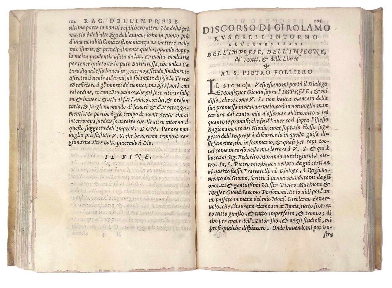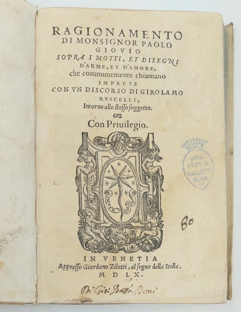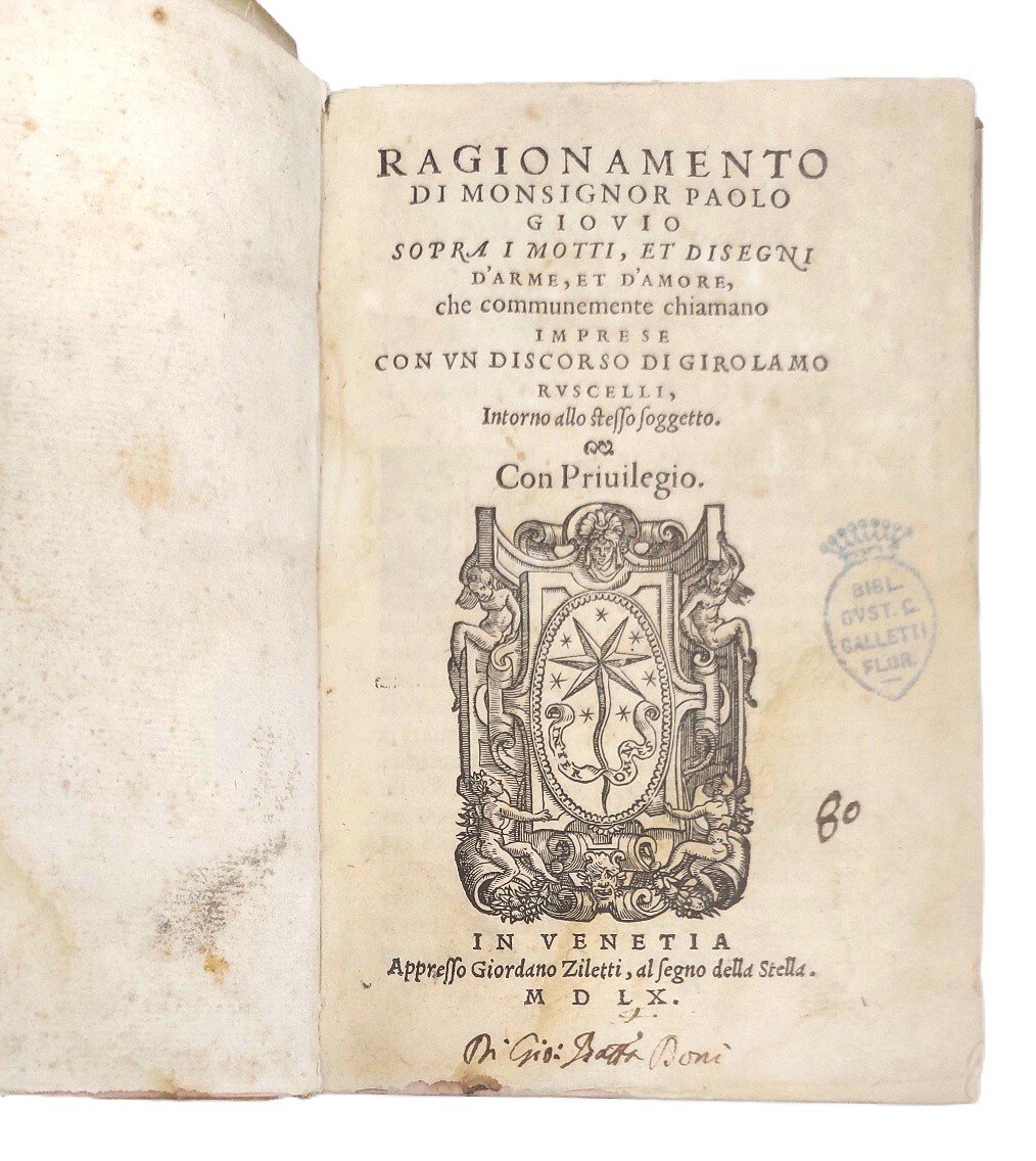 >in-8 piccolo (153x100 mm), pp. (16), 216, ottima legatura coeva in pergamena floscia, titolo manoscritto al dorso, capitelli passanti. Seconda edizione, ristampa della prima del Ruscelli (1556), del fondamentale trattato del Giovio sulla teoria delle imprese, il primo del suo genere. Apparve un anno prima a Roma con il titolo: "Dialogo dell'imprese militari et amorose". "... la suddetta edizione ebbe solo una circolazione limitatissima, presto esaurita e introvabile, mentre gran parte dei lettori contemporanei si servirono dell'edizione procurata da Girolamo Ruscelli per l'editore Ziletti e più volte ristampata a partire dal 1556... Ruscelli, oltre a darci notizie precise sulla tiratura dell'edizione romana, dichiara dunque di aver fondato la sua ristampa su un manoscritto di buona lezione e completo (da osservare l'insistenza sull'incompletezza dell'edizione romana, come a convincere il lettore della genuinità delle addizioni che troverà nella nuova stampa, di certo, invece, frutto di interpolazioni dello stesso Ruscelli) ricevuto da Padova da Giovan Antonio Calco (il dedicatario a cui si rivolge)” (G. Arbizzoni, ‘Un nodo di parole e di cose', pp. 13-14, and D. Caldwell, The XVIth Century Italian ‘Impresa', p. 22-38). Comprende la prima edizione del lavoro di Ruscelli sullo stesso argomento, che ha fortemente contribuito a sviluppare il dibattito teorico sull'Impresa, che dopo la morte di Giovio, doveva risultare nella pubblicazione di un gran numero di trattati, molti dei quali illustrati. Bell'esemplare con importante nota di possesso autografa "Di Gio. Batta Doni", teorico della musica (fiorentino, 1594–1647) noto tra l'altro per aver cambiato nome alla nota Ut ribattezzandola Do prendendola dalla parte del suo cognome Doni. La maggioranza delle sue opere furono pubblicate nel 1763. Al frontespizio timbro della Biblioteca di Gustavo Camillo Galletti, editore e fondatore di una grande biblioteca di incunaboli; al contropiatto l'ex-libris della biblioteca Finaly Landau. Il barone Horace Landau (morto a Firenze 1903) fu rappresentante dei Rotschild a Costantinopoli, a Torino e a Firenze, dove acquistò la villa «alla Pietra», che arricchì di varie collezioni e di una ricca biblioteca, aumentata in seguito dall'erede, Jenny Finaly.