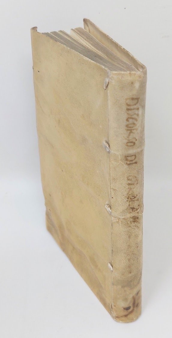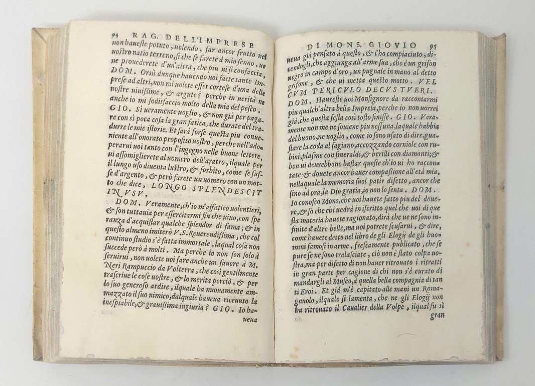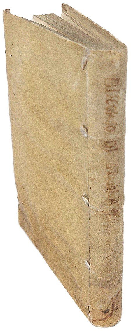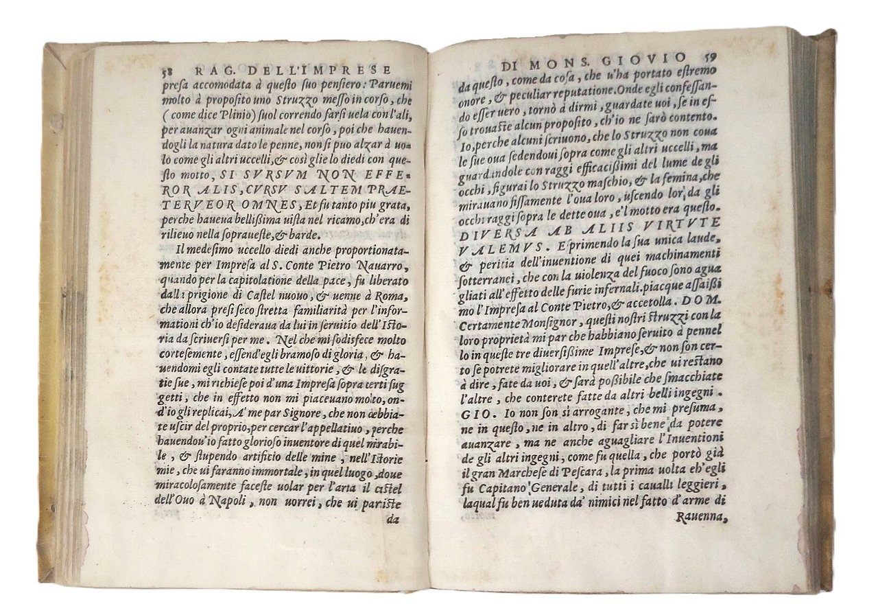>in-8 piccolo (153x100 mm), pp. (16), 216, ottima legatura coeva in pergamena floscia, titolo manoscritto al dorso, capitelli passanti. Seconda edizione, ristampa della prima del Ruscelli (1556), del fondamentale trattato del Giovio sulla teoria delle imprese, il primo del suo genere. Apparve un anno prima a Roma con il titolo: "Dialogo dell'imprese militari et amorose". "... la suddetta edizione ebbe solo una circolazione limitatissima, presto esaurita e introvabile, mentre gran parte dei lettori contemporanei si servirono dell'edizione procurata da Girolamo Ruscelli per l'editore Ziletti e più volte ristampata a partire dal 1556... Ruscelli, oltre a darci notizie precise sulla tiratura dell'edizione romana, dichiara dunque di aver fondato la sua ristampa su un manoscritto di buona lezione e completo (da osservare l'insistenza sull'incompletezza dell'edizione romana, come a convincere il lettore della genuinità delle addizioni che troverà nella nuova stampa, di certo, invece, frutto di interpolazioni dello stesso Ruscelli) ricevuto da Padova da Giovan Antonio Calco (il dedicatario a cui si rivolge)” (G. Arbizzoni, ‘Un nodo di parole e di cose', pp. 13-14, and D. Caldwell, The XVIth Century Italian ‘Impresa', p. 22-38). Comprende la prima edizione del lavoro di Ruscelli sullo stesso argomento, che ha fortemente contribuito a sviluppare il dibattito teorico sull'Impresa, che dopo la morte di Giovio, doveva risultare nella pubblicazione di un gran numero di trattati, molti dei quali illustrati. Bell'esemplare con importante nota di possesso autografa "Di Gio. Batta Doni", teorico della musica (fiorentino, 1594–1647) noto tra l'altro per aver cambiato nome alla nota Ut ribattezzandola Do prendendola dalla parte del suo cognome Doni. La maggioranza delle sue opere furono pubblicate nel 1763. Al frontespizio timbro della Biblioteca di Gustavo Camillo Galletti, editore e fondatore di una grande biblioteca di incunaboli; al contropiatto l'ex-libris della biblioteca Finaly Landau. Il barone Horace Landau (morto a Firenze 1903) fu rappresentante dei Rotschild a Costantinopoli, a Torino e a Firenze, dove acquistò la villa «alla Pietra», che arricchì di varie collezioni e di una ricca biblioteca, aumentata in seguito dall'erede, Jenny Finaly.