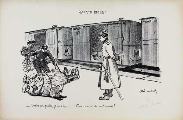 Louis ABEL-TRUCHET (1857-1918) Litografia originale numerata e firmata a mano dall'artista, Esemplare N. 86/275 - Anno 1914-1915Dimensioni folio: 56 x 38,5 cmCon Certificato di Autenticità C.O.A. Rappresentazione satirica riguardante l'esercito francese durante la prima guerra mondiale. Louis Abel-Truchet è stato un pittore francese, esponente del post-impressionismo.Ha studiato all'Académie Julian dove fu allievo dei pittori Benjamin Constant e Jules Joseph Lefebvre. A partire dal 1891 espose i dipinti, in particolare al Salon d'Automne, al Salon des artistes français ed alla Société nationale des beaux-arts di cui fu membro nel 1910. Abel-Truchet privilegia soggetti della moderna vita urbana di Parigi e specificamente il quartiere di Montmartre. È anche conosciuto come ritrattista e per i suoi paesaggi riportati dai suoi viaggi nel sud della Francia ed in Italia. In occasione di un soggiorno in Tunisia, fece anche dipinti orientalisti.Volontario all'inizio della Prima guerra mondiale, fece parte nel 1915 di una squadra pionieristica che si occupava di camuffamento militare. Divenne quindi sottotenente nel 1º reggimento del genio, fu ferito nel settembre 1918 e morì a causa delle sue ferite.Due dipinti furono esposti a titolo postumo all'esposizione degli artisti morti per la patria al Salone d'automne del 1919.Nel XVII arrondissement di Parigi la via dove si trovava la sede dell'Associazione dei pittori-litografi porta ormai il suo nome. Louis ABEL-TRUCHET (1857-1918) Originallithographie nummeriert und vom Künstler von Hand signiert, Kopie Nr. 86/275 - Jahr 1914-1915Foliogröße: 56 x 38,5 cmMit Echtheitszertifikat C.O.A. Satirische Darstellung der französischen Armee während des Ersten Weltkriegs. Louis Abel-Truchet war ein französischer Maler, Vertreter des Postimpressionismus. Er studierte an der Académie Julian, wo er Schüler der Maler Benjamin Constant und Jules Joseph Lefebvre war. Ab 1891 stellte er die Gemälde insbesondere im Salon d'Automne, im Salon des artistes français und in der Société nationale des beaux-arts aus, deren Mitglied er 1910 war. Abel-Truchet privilegiert Themen des modernen Stadtlebens in Paris und insbesondere die Montmartre Nachbarschaft. Er ist auch als Porträtmaler bekannt und für seine Landschaften von seinen Reisen in Südfrankreich und in Italien berichtet. Während eines Aufenthalts in Tunesien fertigte er auch orientalistische Gemälde an. Zu Beginn des Ersten Weltkriegs war er freiwillig Teil eines Pionierteams, das sich 1915 mit militärischer Tarnung befasste. Anschließend wurde er Leutnant im 1. Genie-Regiment, wurde im September 1918 verletzt und starb an seinen Verletzungen. Zwei Gemälde wurden posthum auf der Ausstellung der Künstler ausgestellt, die 1919 auf der Autonomen Automobilausstellung für ihre Heimat starben. Paris, die Straße, in der sich das Hauptquartier der Vereinigung der Maler-Lithographen befand, trägt jetzt seinen Namen. Louis ABEL-TRUCHET (1857-1918) Lithographie originale numérotée et signée à la main par l'artiste, exemplaire n ° 86/275 - Année 1914-1915Taille du folio: 56 x 38,5 cmAvec certificat d'authenticité C.O.A. Représentation satirique concernant l'armée française pendant la Première Guerre mondiale. Peintre français, défenseur du post-impressionnisme, Louis Abel-Truchet étudie à l'Académie Julian où il est l'élève des peintres Benjamin Constant et Jules Joseph Lefebvre. À partir de 1891, il expose les toiles, notamment au Salon d'Automne, au Salon des artistes français et à la Société nationale des beaux-arts dont il est membre en 1910. Abel-Truchet privilégie les sujets de la vie urbaine moderne à Paris et plus particulièrement le Quartier Montmartre. Il est également connu comme portraitiste et pour ses paysages rapportés par ses voyages dans le sud de la France et en Italie. Lors d'un séjour en Tunisie, il réalise également des tableaux orientalistes.Bénévole au début de la Première Guerre mondiale, il fait partie d'une équipe pionnière en 1915 qui s'occupe du camouflage militaire. Il devient alors sous-lieutenant du 1er régiment de génie, est blessé en septembre 1918 et meurt de ses blessures. Deux tableaux sont exposés à titre posthume à l'exposition des artistes décédés pour leur patrie au Salon de l'automobile de 1919. Paris la rue où se trouvait le siège de l'Association des Peintres-Lithographes porte désormais son nom. Louis ABEL-TRUCHET (1857-1918) Original lithograph numbered and signed by hand by the artist, Copy No. 86/275 - Year 1914-1915Folio size: 56 x 38.5 cmWith Certificate of Authenticity C.O.A. Satirical representation concerning the French army during the First World War. Louis Abel-Truchet was a French painter, exponent of post-impressionism. He studied at the Académie Julian where he was a pupil of the painters Benjamin Constant and Jules Joseph Lefebvre. Starting from 1891 he exhibited the paintings, in particular at the Salon d'Automne, the Salon des artistes français and the Société nationale des beaux-arts of which he was a member in 1910. Abel-Truchet privileges subjects of modern urban life in Paris and specifically the Montmartre neighborhood. He is also known as a portrait painter and for his landscapes reported by his travels in the south of France and in Italy. During a stay in Tunisia, he also made orientalist paintings. Volunteer at the beginning of the First World War, he was part of a pioneering team in 1915 that dealt with military camouflage. He then became second lieutenant in the 1st genius regiment, was injured in September 1918 and died of his injuries. Two paintings were exhibited posthumously at the exhibition of the artists who died for their country at the 1919 Autonomous Salon. In the 17th arrondissement of Paris the street where the headquarters of the Association of Painters-Lithographers was located now bears his name.