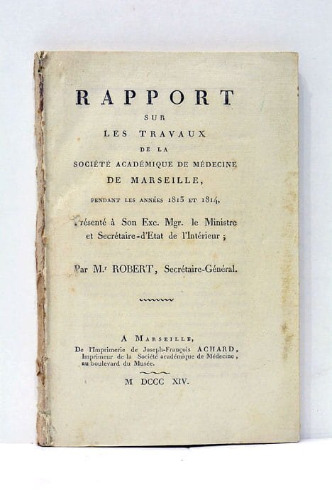 1 feuillet. 129 pages. (13x19,5 Cm). Dérelié. Premier rapport de la Société Académique de Marseille, fondée l’année précédente à l’occasion d’une épidémie de fièvre qui avait touché la ville. Il contient l’exposé de ces circonstances et des premières actions de l’Académie, ainsi que la relation des travaux effectués par ses membres depuis sa création. Document en très bon état.
