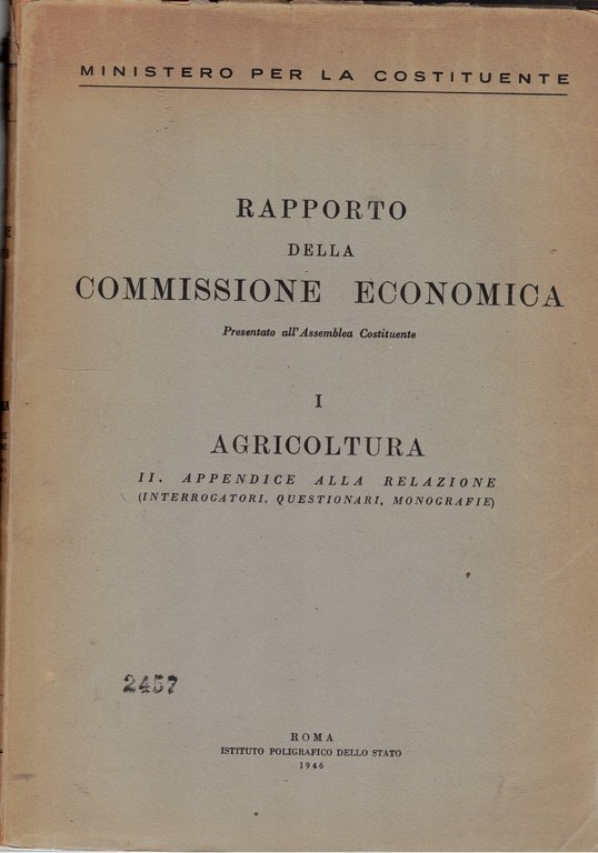 Rapporto della commissine economica presentato all'assemblea costituente vol. I° Agricoltura, IIa appendice alla relazione (interrogatori, questionari, monografie).