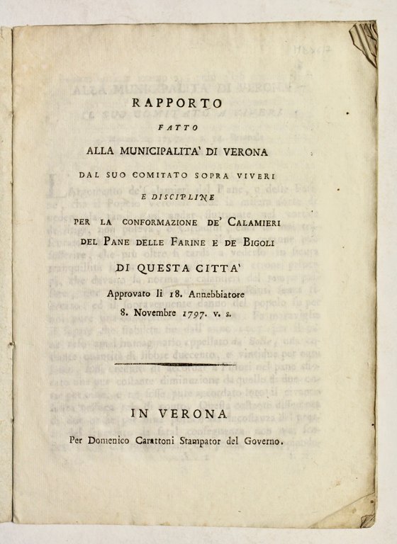 Rapporto fatto alla Municipalità di Verona dal suo comitato sopra i viveri e discipline per la conformazione de' calmieri del pane elle farine e de bigoli di questa città.