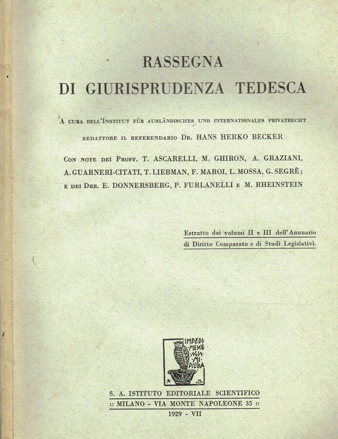 A cura dell'Institut fur Auslandisches und Internationales Privatrecht, con note di Ascarelli, Ghiron, Graziani, Guarneri-Citati, Liebman ed altri, pagine brunite attorno ai testi e con lieve fioritura, brossura editoriale morbida, parzialmente ingiallita, con fioritura e segni di usura ai bordi Numero Pagine 93