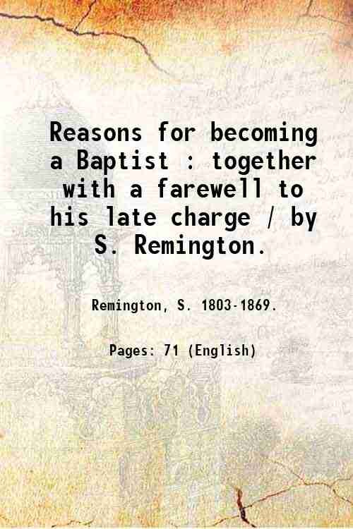 Reasons for becoming a Baptist : together with a farewell to his late charge / by S. Remington. 1851