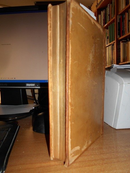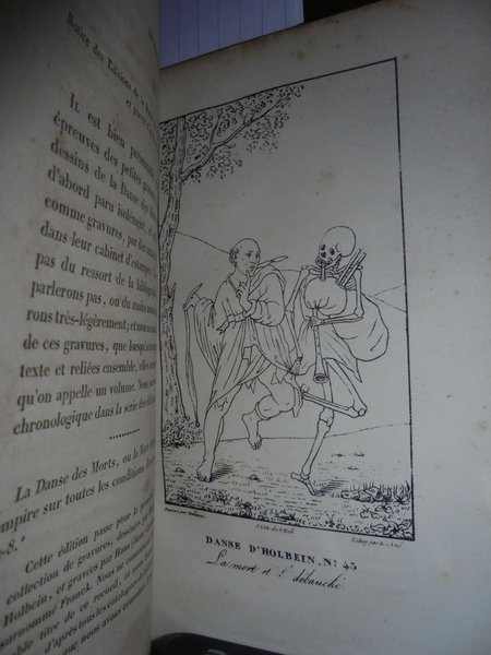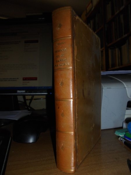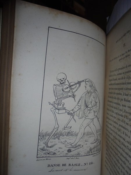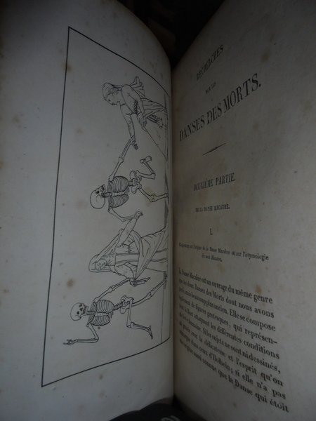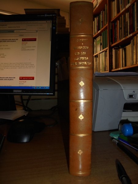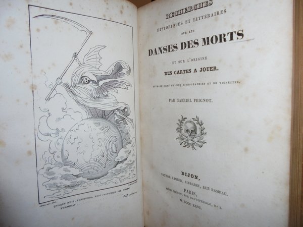 Gabriel, Peignot. Dijon, Victor Lagier, 1826. Recherches Historiques et littéraires sur les DANSES DES MORTS et sur l' origine des Cartes a Jouer. Edizione originale. In-8°, pena pelle coeva, duplice filetto in oro sui piani, fregi e titolo in oro al dorso, tagli dorati. LX, 367, (1) pp. (errata). Ouvrage orné de cinq lithographies et de vignettes. Ex Libris nei risguardi. Lievi fioriture in poche pagine dovute alla qualità della carta ma bell' esemplare. Raro. Neg. mob. 8.