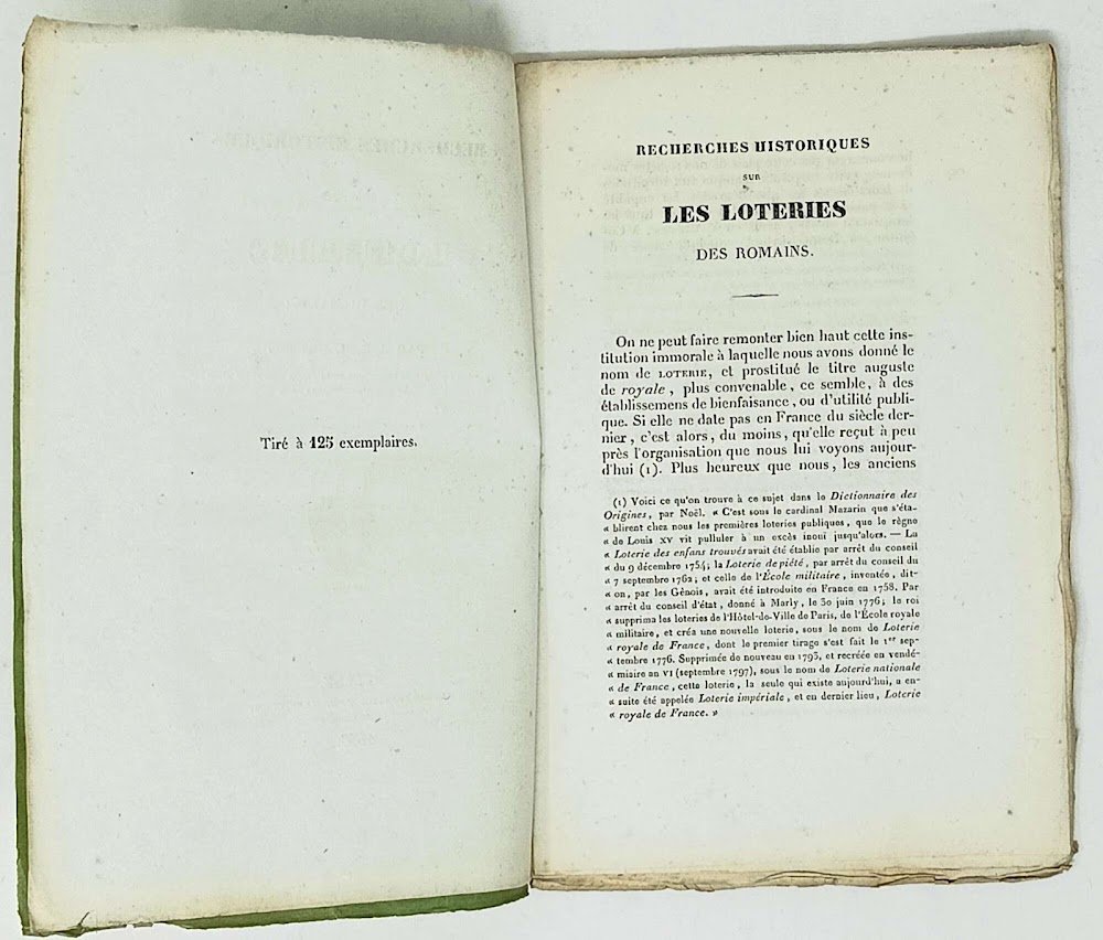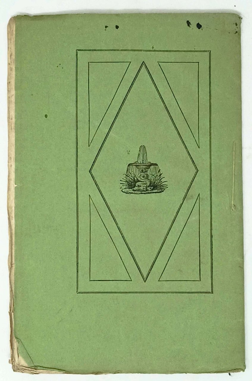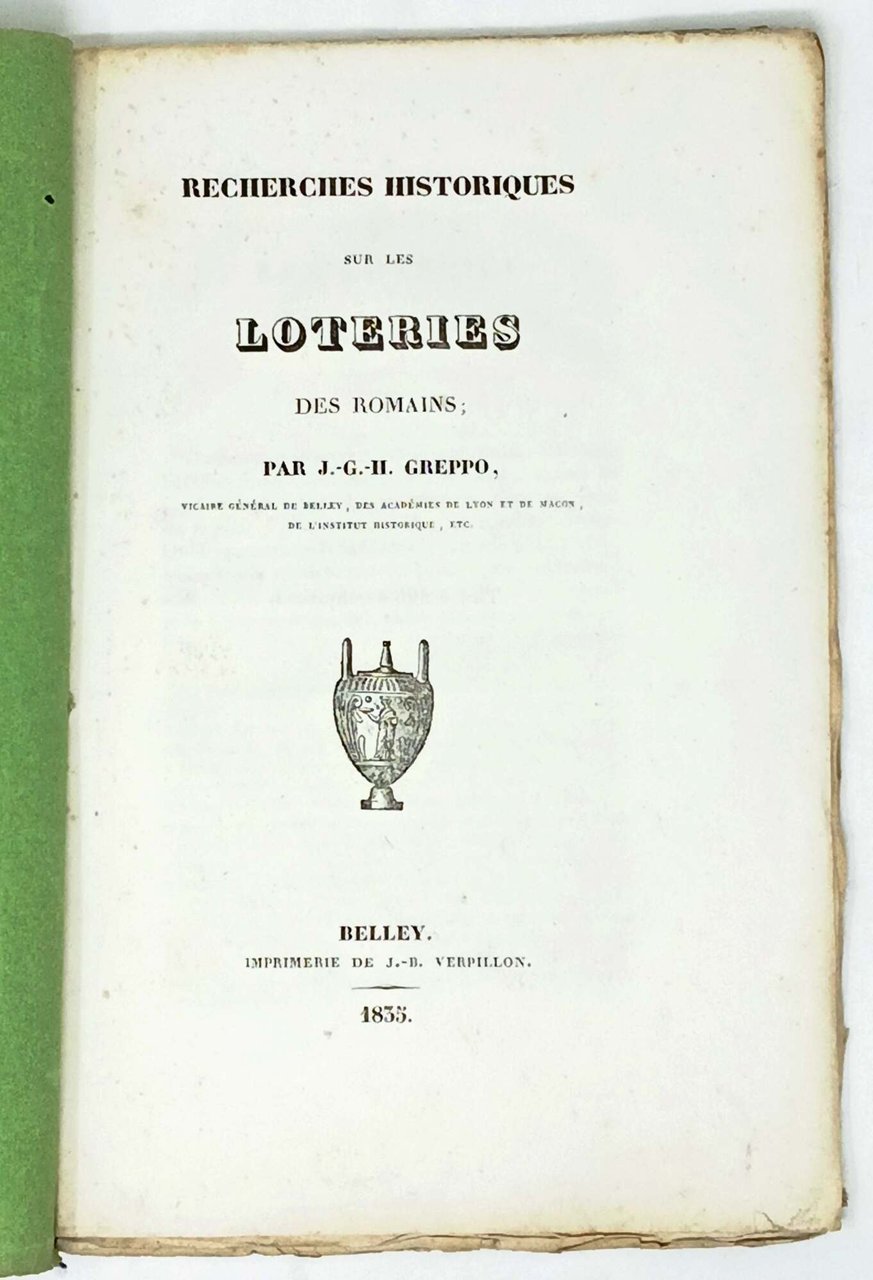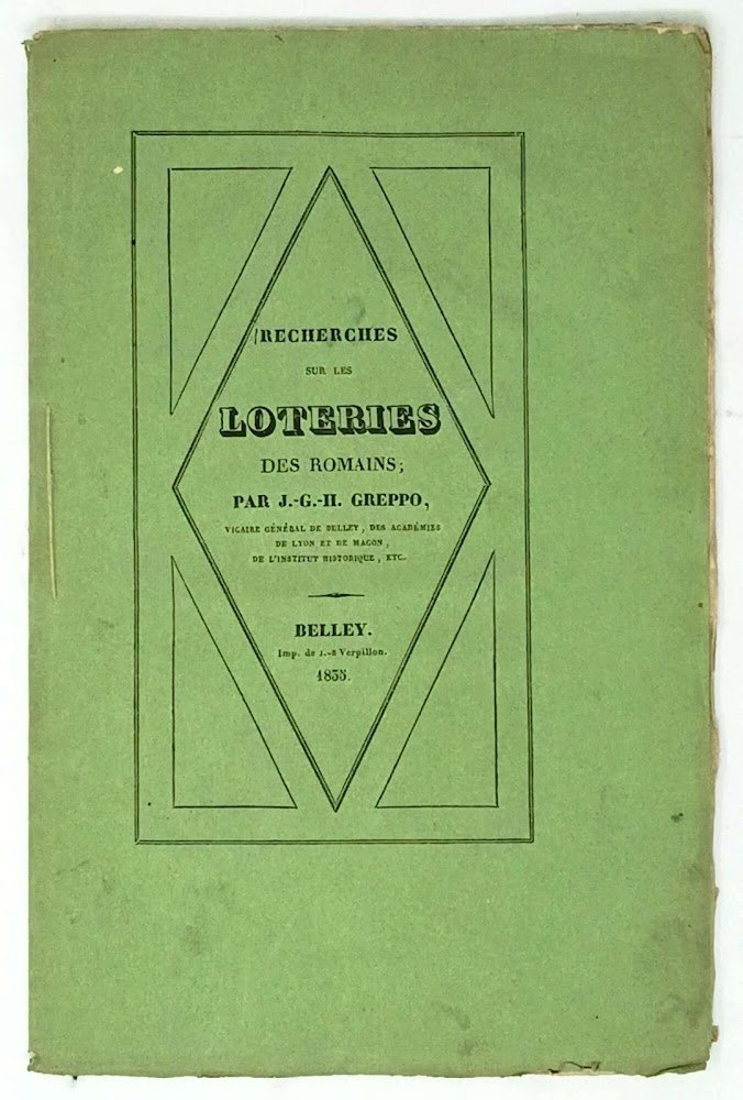 >in -8 (mm 2232 x 142), pp. (3) 4-32, brossura editoriale verde con titolo entro riquadro geometrico, al piatto posteriore riquadro con piccola immagine di fontana. Greppo, vicario generale di Belley e membro dell'Istituto storico, ha esplorato la storia delle lotterie romane, diverse da quelle moderne, ma pur sempre associate alla passione per il gioco e all'avidità. Curiosa opera in tiratura limitata di 125 esemplari. Buono stato, ampi margini.